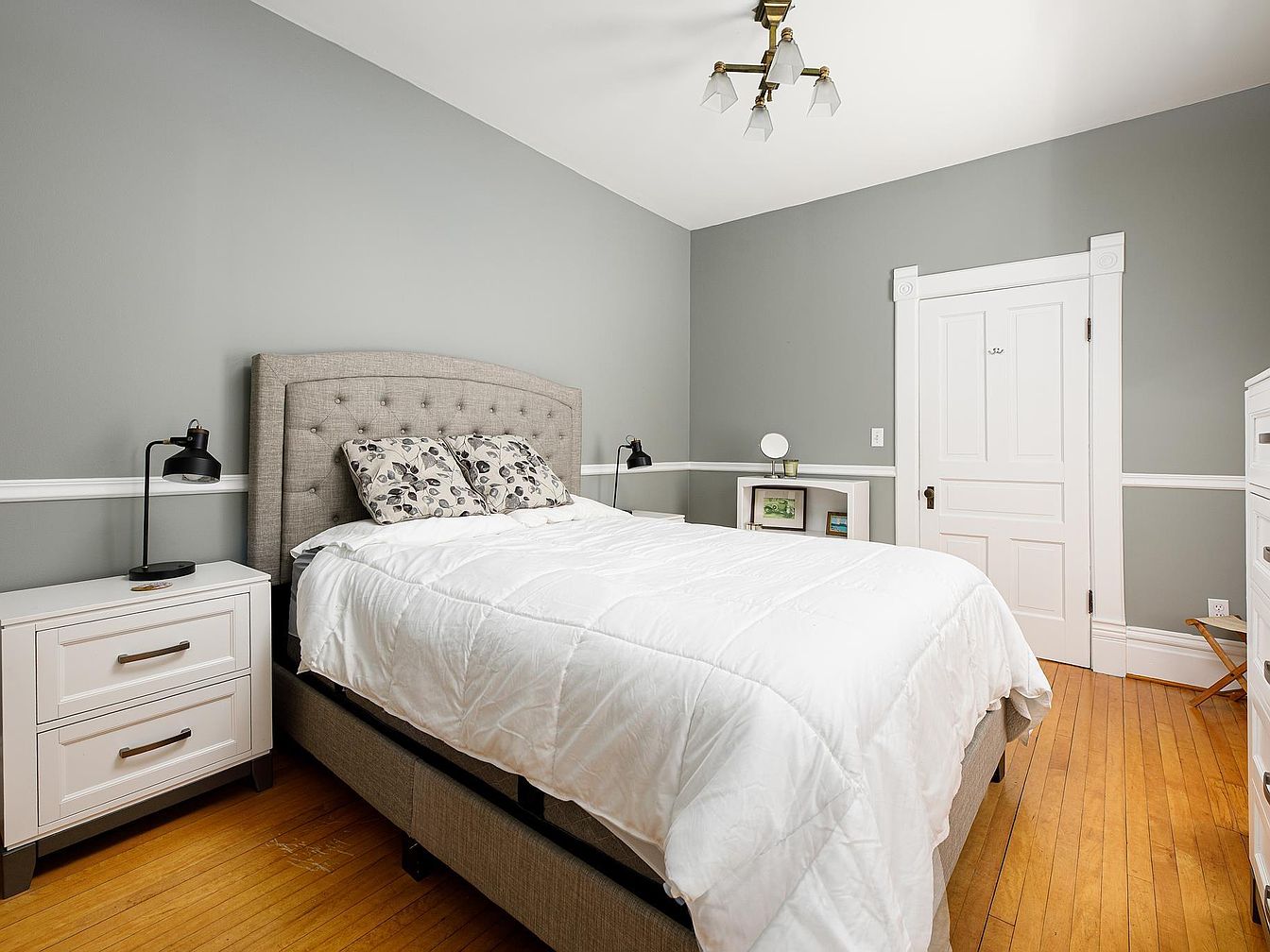 This bedroom showcases a serene, modern aesthetic with a subtle color palette. The walls are painted in a soft, muted gray, providing a calming backdrop. A plush, tufted headboard upholstered in light beige fabric complements a crisp white duvet on the bed. Two decorative pillows feature floral patterns, adding a touch of charm. Beside the bed, a sleek nightstand holds a black lamp with an industrial vibe. Architectural details include a classic white trim and a solid door with vintage-style hardware. Light wood flooring enhances warmth, while a minimalist reading corner features a small shelf and a round lamp, enhancing functionality.