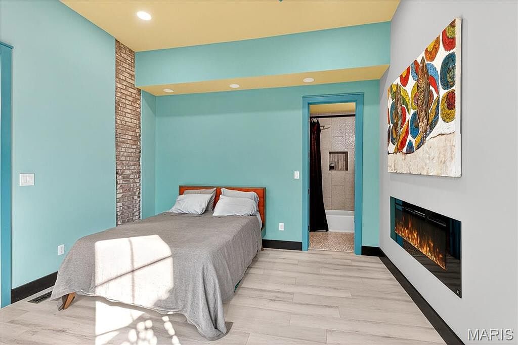 This cozy bedroom features a vibrant color palette, with turquoise walls complemented by a warm yellow ceiling. A wooden bed frame holds a gray blanket and crisp white pillows, creating a relaxed atmosphere. The wall opposite the bed showcases a contemporary artwork filled with colorful circles, adding a playful touch. Dark trim outlines the space, while a striking faux fireplace integrated into the wall provides modern elegance. An exposed brick wall introduces texture, contrasting with smooth surfaces. A door leads to an en-suite bathroom, discretely draped with a dark curtain, emphasizing the room’s serene ambiance.
