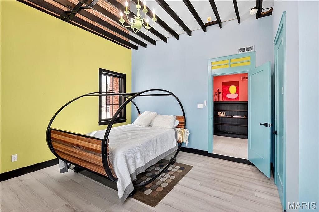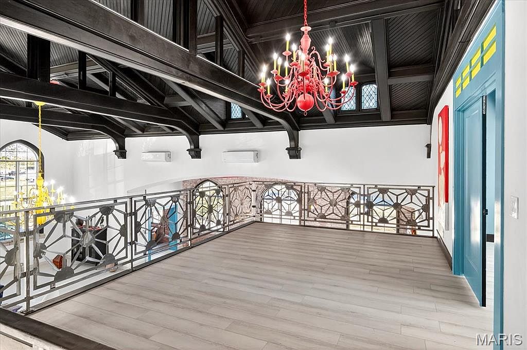 A spacious loft area featuring exposed black wooden beams creates a dramatic ceiling. The room is adorned with a striking red chandelier, adding a bold touch against the predominantly white walls. Light-colored wooden flooring complements the vibrant decor. A unique metal railing with intricate geometric patterns enhances the architectural charm. Bright wall art in red and yellow introduces playful accents, while a deep blue door stands out, inviting curiosity. Large, arched windows provide ample natural light, contributing to a bright, airy atmosphere. The overall design balances modern elements with traditional craftsmanship, creating an inviting and stylish space.