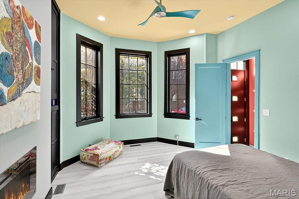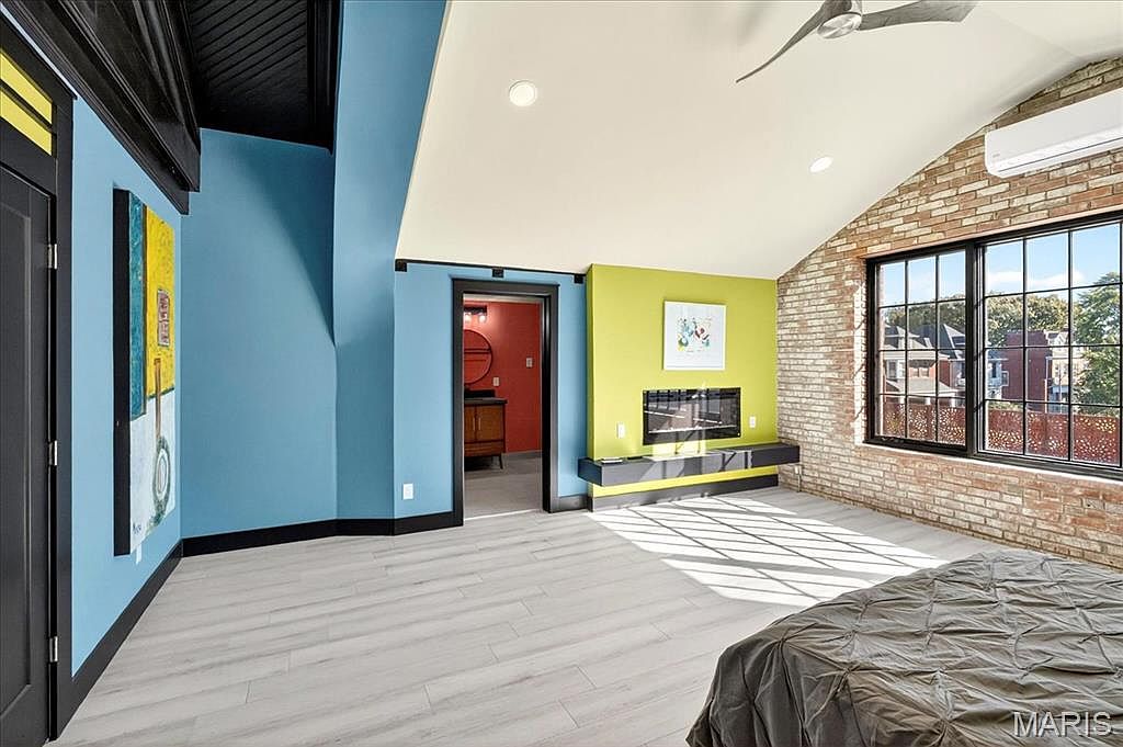 This master bedroom features a striking blend of colors and textures. The walls showcase a vibrant blue contrasting against a bold lime green accent wall, creating a dynamic visual effect. Exposed brick adds warmth and character, while large windows invite ample natural light, enhancing the spacious feel. A sleek, dark wood platform serves as a contemporary focal point beneath a mounted television. The ceiling boasts angular lines, emphasizing height and openness. Neutral-colored flooring complements the lively palette. An abstract painting adds an artistic touch, integrating seamlessly with the room’s modern aesthetics.