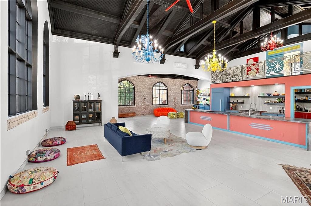 This unique living room features a high ceiling supported by exposed wooden beams, exuding a spacious and airy feel. Bright white walls enhance natural light through large arched windows, complemented by contrasting dark trim. A plush navy sofa serves as a focal point, accented by colorful throw cushions. A round white chair and a textured rug create a cozy seating area. Vibrant chandeliers, one yellow and one blue, add playful sophistication. An exposed brick wall introduces rustic charm, while decorative elements like potted plants and eclectic artworks contribute to a lively, inviting atmosphere.