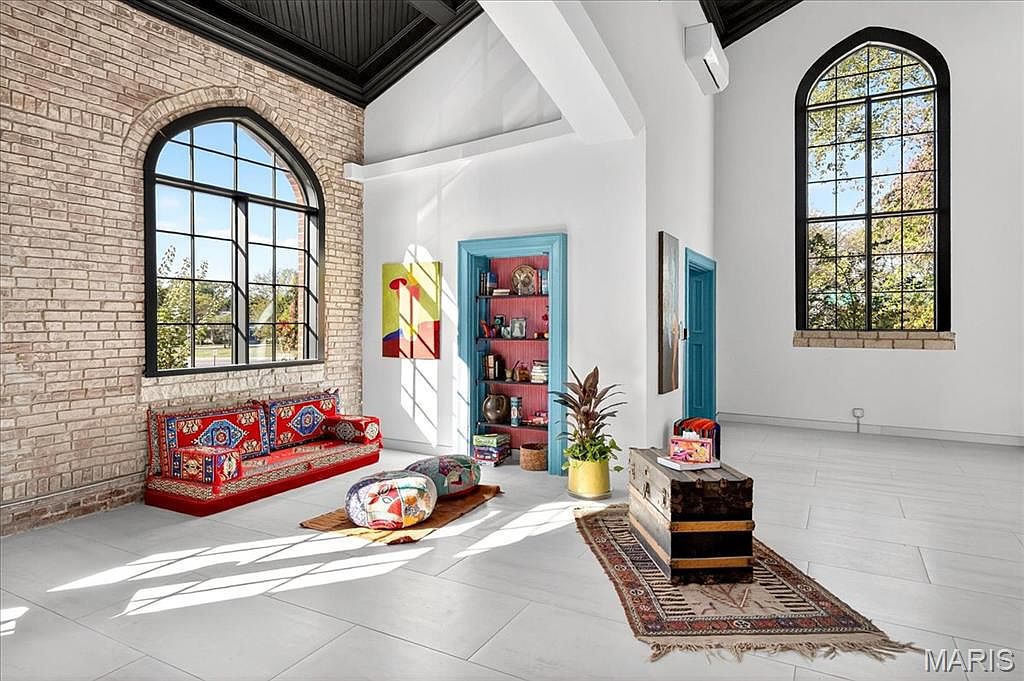 This spacious living room features a striking blend of modern and historic elements. The brick wall adds warmth, contrasted by high, vaulted ceilings painted black. Large, gothic-style windows allow ample natural light, highlighting a vibrant red and blue patterned couch adorned with plush cushions. A colorful pouf and a wooden low table sit on a decorative rug, enhancing the cozy atmosphere. On one wall, an open bookshelf is painted in a bright turquoise, showcasing art pieces and books, while a potted plant brings a touch of greenery. The overall aesthetic is a mix of eclectic bohemian and contemporary design.