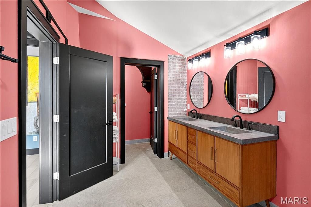 A contemporary bathroom features striking coral walls, enhancing its vibrant aesthetic. On one side, a sleek dual-sink vanity in warm wood tones contrasts beautifully with a dark countertop. Above, two round mirrors reflect light from modern, industrial-style fixtures, casting a warm glow. The flooring consists of large, light-colored tiles, adding a sense of spaciousness. Doorways are framed with bold black doors, emphasizing a modern design. A side storage unit displays neatly rolled towels, contributing to the room’s functionality. The combination of colors and materials creates a fresh, inviting atmosphere, balancing style with practicality for everyday use.