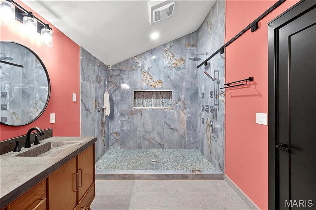 This modern bathroom features a stunning blend of materials and colors. The shower area stands out with its striking gray marble walls, highlighted by subtle golden veining that adds elegance. A polished stone bench within the shower complements the spacious design. The vibrant coral wall contrasts beautifully with the cooler tones of the marble, creating a dynamic atmosphere. A round, frameless mirror above the dark countertop enhances the contemporary aesthetic, while matte black fixtures provide a sleek touch. The overall layout is open and airy, emphasizing a minimalist yet luxurious feel, ideal for a relaxing retreat.