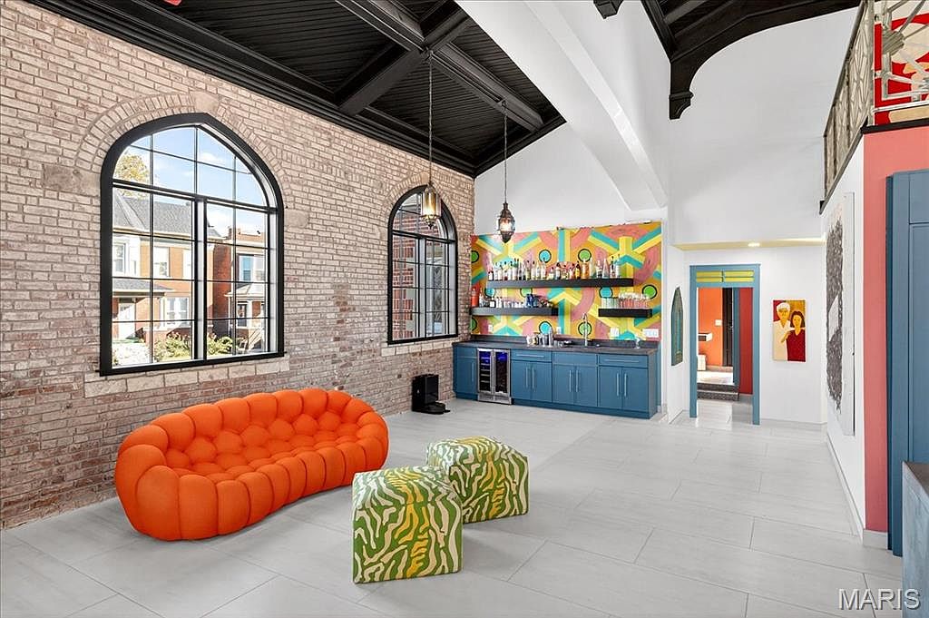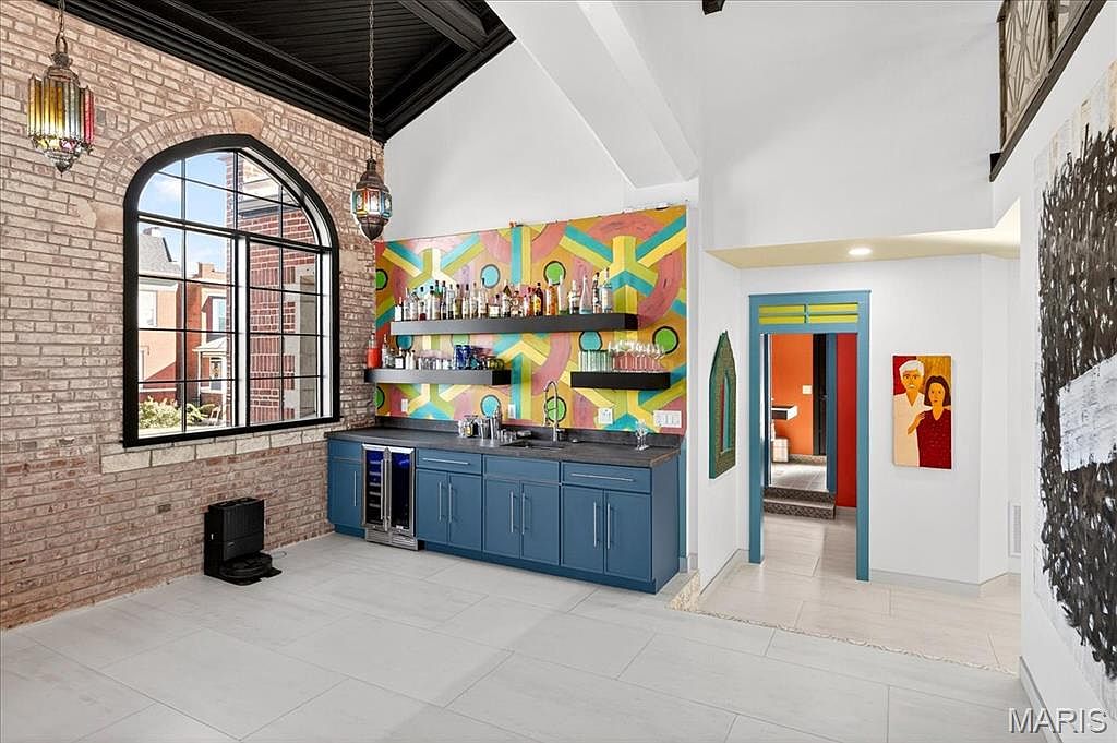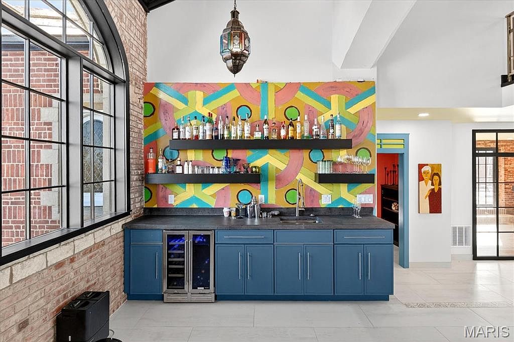 This vibrant home bar area features exposed brick walls with large arched windows that illuminate the space. A colorful, geometric backsplash adds an artistic flair above dark cabinetry, which houses an impressive collection of beverages. Both the cabinets and the countertop are designed with a modern touch, contrasting with the rustic charm of the brick. Decorative pendant lights hang from the high ceiling, enhancing the inviting atmosphere. The flooring is sleek, enhancing the overall spacious feel. A doorway adorned with bold colors leads to another room, while artwork on the walls adds personality to the stylish environment.