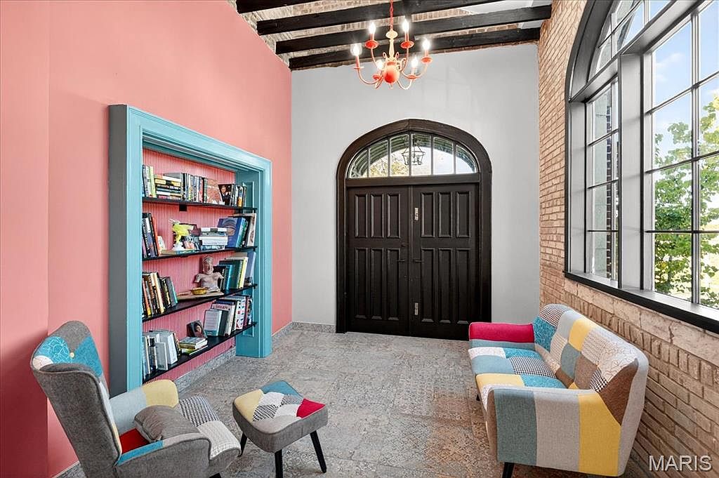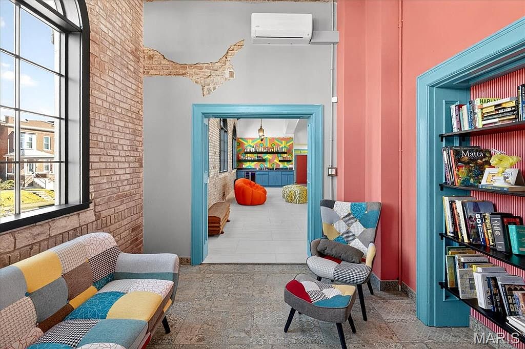 This entryway showcases a blend of contemporary and rustic elements. Exposed brick walls form a backdrop, creating an inviting warmth. The large window allows natural light to flood the space, enhancing its openness. A multicolored patchwork sofa adds playfulness, while a patterned accent chair brings in texture. The frames and door casings are painted in a bright turquoise, contrasting harmoniously with the warm tones of the brick. A modern bookshelf filled with books lines one side, adding a touch of sophistication. Beyond the doorway, glimpses of vibrant artwork and modern furniture suggest a lively adjoining room.