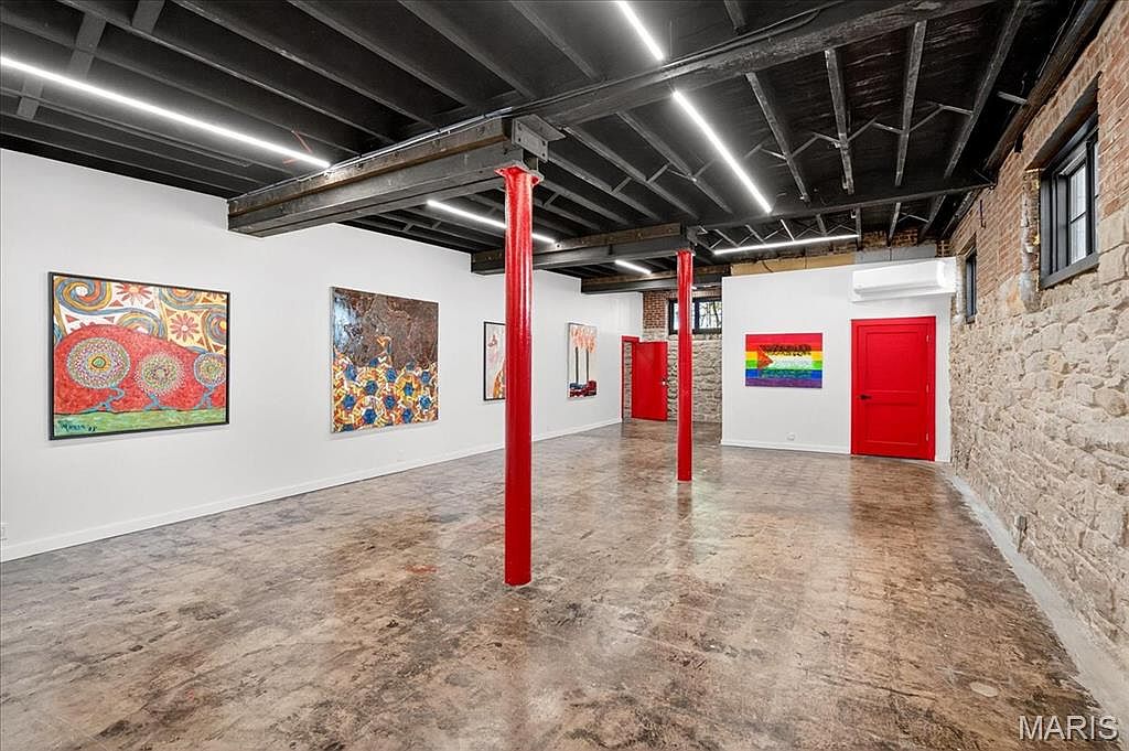 A spacious art gallery featuring a mix of contemporary artworks displayed on white walls, enhancing their vibrancy. Exposed brick adds character to the space, contrasting with the sleek, polished concrete floor. Bright red support columns punctuate the area, adding an unexpected pop of color. The ceiling is adorned with dark wooden beams, creating an industrial feel. Soft, modern lighting illuminates the artwork, highlighting textures and colors effectively. Two striking red doors complement the gallery’s aesthetic, leading to other areas. This inviting space encourages exploration and appreciation of art in a beautifully historic setting.
