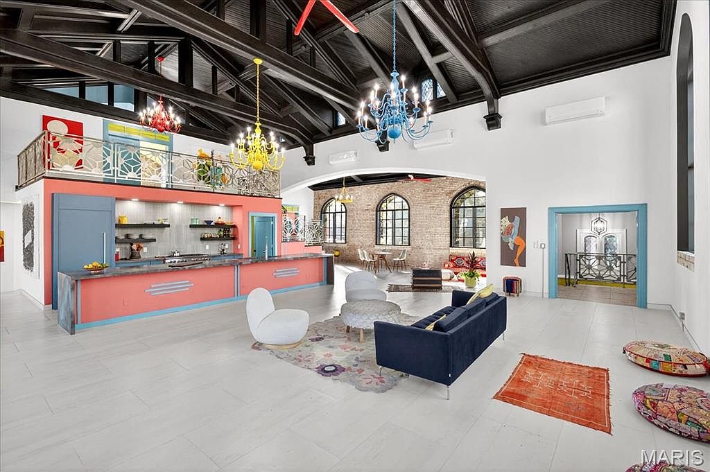 This spacious open kitchen features high vaulted ceilings with exposed dark wood beams, contributing to an airy atmosphere. The bright coral and turquoise cabinetry contrasts beautifully with the sleek gray countertop, while modern appliances are seamlessly integrated. Fun and bold artwork lines the back wall, adding a vibrant pop of color. Circular plush seating provides a cozy nook, complemented by a patterned area rug that anchors the space. Large arched windows allow natural light to flood in, enhancing the warmth of the brick walls. Industrial-style lighting fixtures add a contemporary touch, making the area inviting and functional.