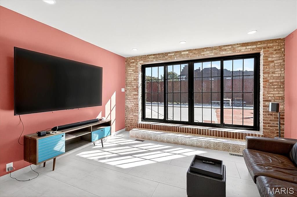 This contemporary living room features a striking contrast between a vivid coral accent wall and exposed brick, creating a warm, inviting atmosphere. A large flat-screen television is mounted opposite a stylish turquoise and wood media console. Natural light floods through a sizable black-framed window, illuminating a spacious seating area with a brown leather sofa and a patterned bench. The flooring consists of large, light-colored tiles, enhancing the airy feel. Clean lines and minimalist decor contribute to a modern aesthetic, while the combination of textures adds depth to the space, making it ideal for relaxation and socializing.