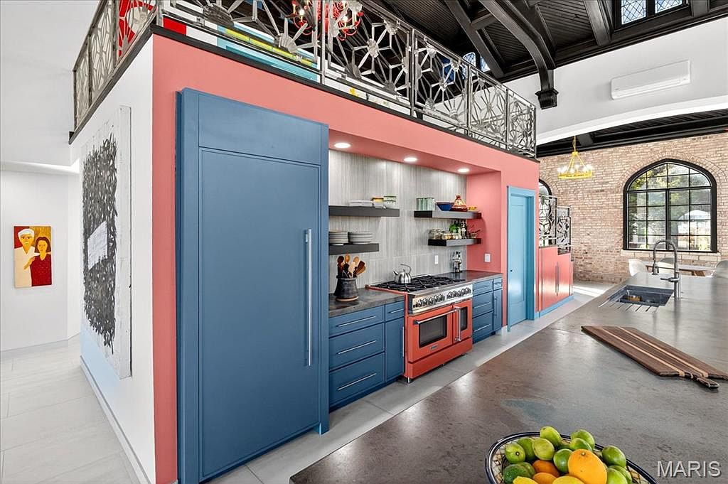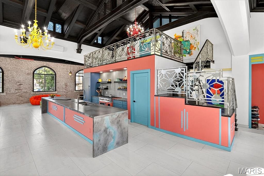 This vibrant kitchen showcases an open layout with high ceilings featuring dark wooden beams. The walls blend exposed brick with a striking color palette, combining teal and coral. A large central island serves as a workspace, accented by a unique, patterned countertop that mixes gray and blue hues. Modern appliances are seamlessly integrated into the design, with colorful dishware adding playful touches. A brightly colored chandelier hangs above, enhancing the eclectic aesthetic. Large arched windows fill the area with natural light, while an intricate metal railing leads to a lofted space, adding depth and architectural interest.