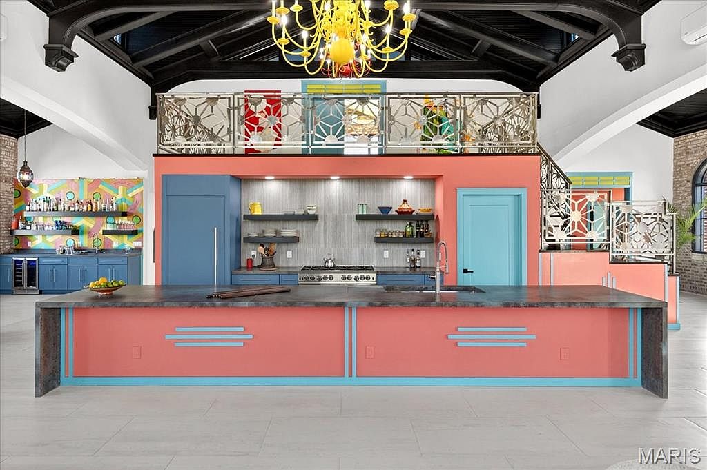 The kitchen features a vibrant, modern design with a large central island topped with a dark stone surface. The cabinetry is a mix of bold coral and soothing blue hues, enhancing its lively aesthetic. A colorful, geometric-patterned wallpaper adds energy to the background, contrasting with stylish open shelving filled with decorative bottles. The kitchen is illuminated by an ornate yellow chandelier, complementing the high ceilings supported by dark beams. The open layout invites natural light through large windows, and intricate metal railings on the upper level add an architectural element that contrasts with the playful color scheme.