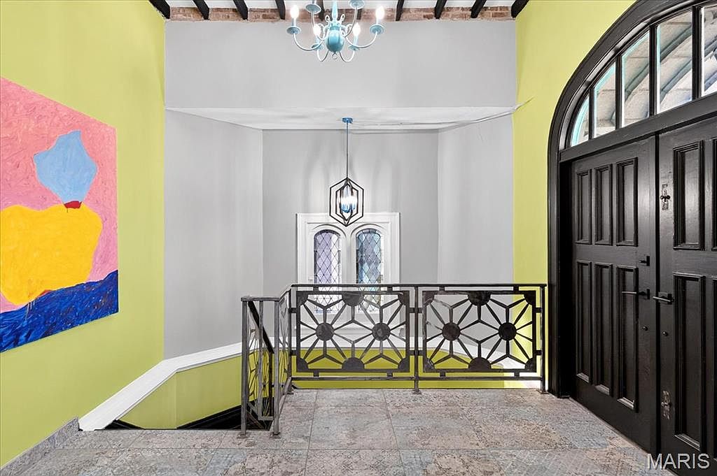 This entryway features a striking blend of modern and historical elements. A vibrant lime green wall contrasts with a muted gray, creating a bold color scheme. A large, abstract painting in bright hues dominates one wall, adding an artistic flair. A vintage-style chandelier hangs from the ceiling, illuminating the space with a soft glow. The wrought iron railing showcases intricate geometric patterns, contributing to the architectural detail. The double front doors, finished in a rich black, enhance the elegance of the entrance. Natural light filters through a large arched window, giving an inviting feel to the area.