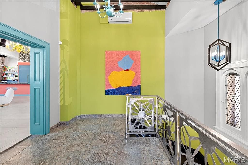 The entryway features an eclectic color scheme dominated by a vibrant green wall, creating a lively atmosphere. A large abstract painting adds a pop of color with bold hues of blue, pink, and yellow, enhancing the artistic vibe. The floor, showcased in polished stone, complements the walls while contrasting with the decorative metal railing, which features geometric designs. A uniquely styled pendant light hangs from the ceiling, offering modern illumination. Flanking the entryway is a turquoise door, echoing the playful color palette, while the high ceilings and exposed beams impart a spacious and airy feel.