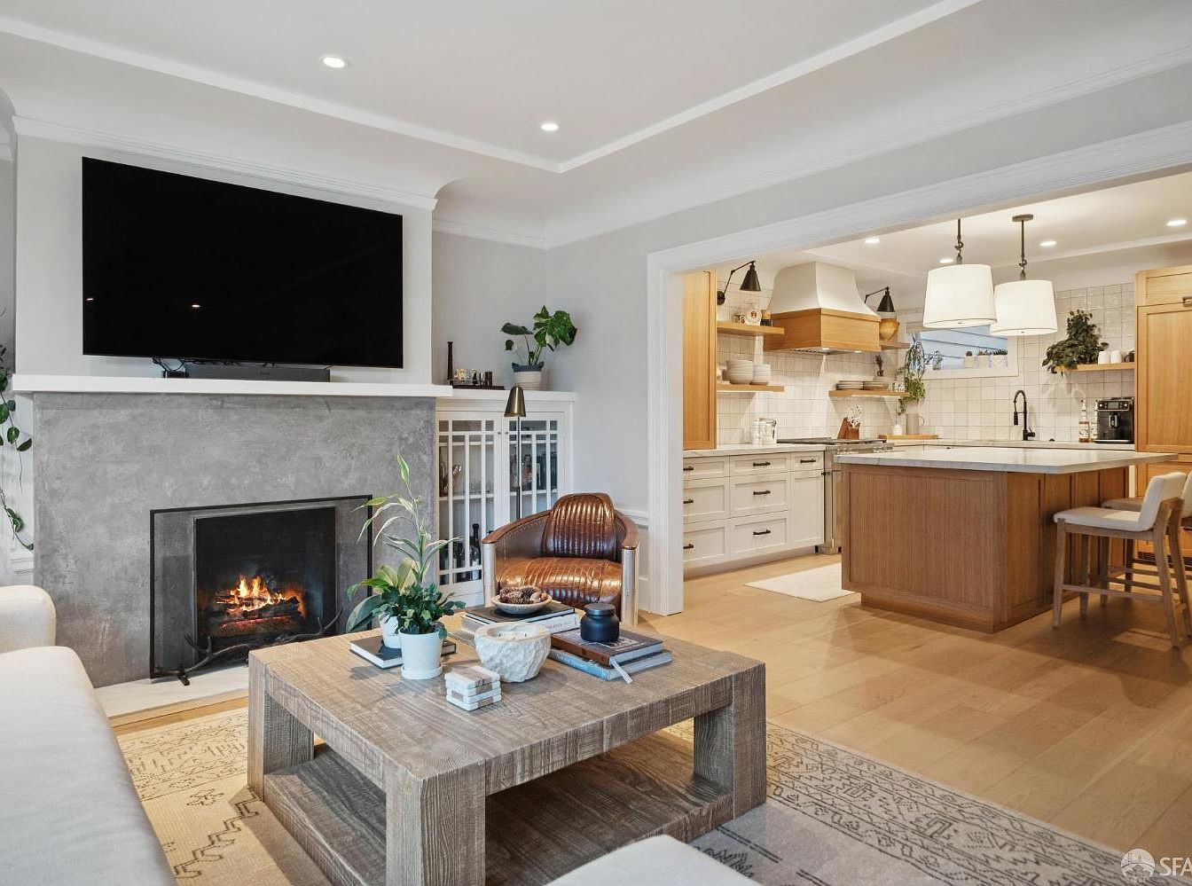 The living room features a modern aesthetic with a cozy ambiance. A sleek, gray stone fireplace serves as a central focal point, complemented by a large flat-screen TV mounted above. The space is adorned with natural light and indoor plants that bring life to the area. A wooden coffee table with a textured finish and decorative items, including books and a potted plant, sits centrally on a patterned rug. A stylish leather armchair adds warmth while a seamless view into the adjoining kitchen showcases light wood cabinetry and a white marble island, harmonizing the contemporary design throughout the home.