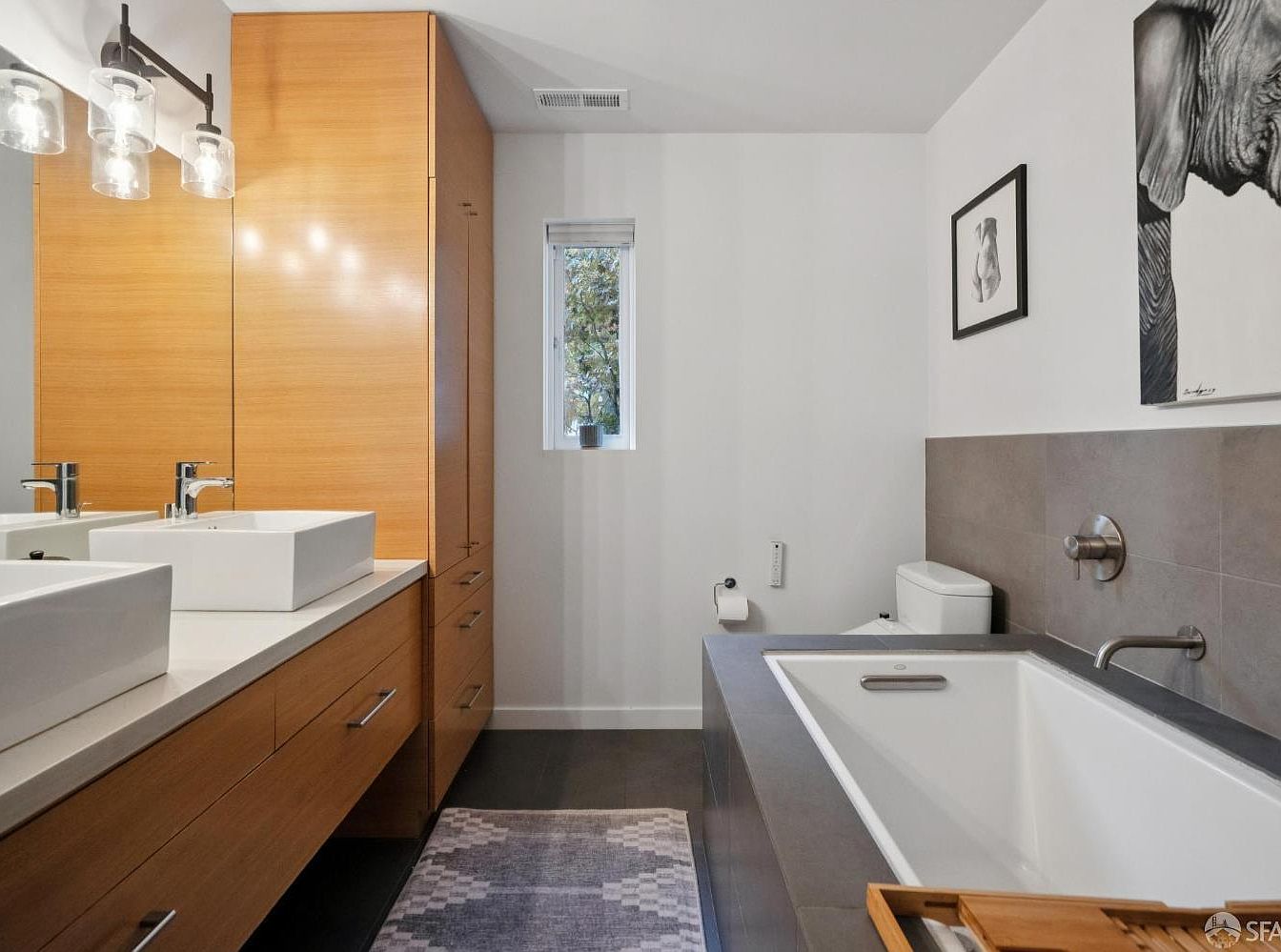 This modern bathroom features a sleek layout with minimalist aesthetics. Natural wood cabinetry in a warm tone complements the light-colored countertop. Dual square sinks are elegantly paired with contemporary faucets, providing a practical yet stylish touch. The walls are adorned with subtle white and gray tones, enhancing the space’s brightness. A large, frameless mirror reflects the room’s openness, while shadowed lighting creates a relaxing ambiance. Elegant fixtures, including a freestanding bathtub, are juxtaposed against textured gray tiles, contributing to a refined look. A small window invites natural light, and curated artwork adds a splash of personality.