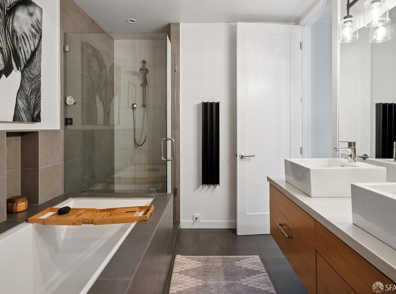This modern bathroom features a sleek design with a neutral color palette of soft grays and whites. A spacious glass shower is situated next to a deep tub, showcasing a wood bath tray for added functionality. The flooring is finished in chic dark tiles, while a large mirror and elegant vanity sinks enhance the room’s sophistication. A striking black radiator adds an unexpected touch against the white walls, complementing a bold piece of artwork depicting an elephant. Soft lighting fixtures illuminate the space, creating a calming and inviting atmosphere, perfect for relaxation.