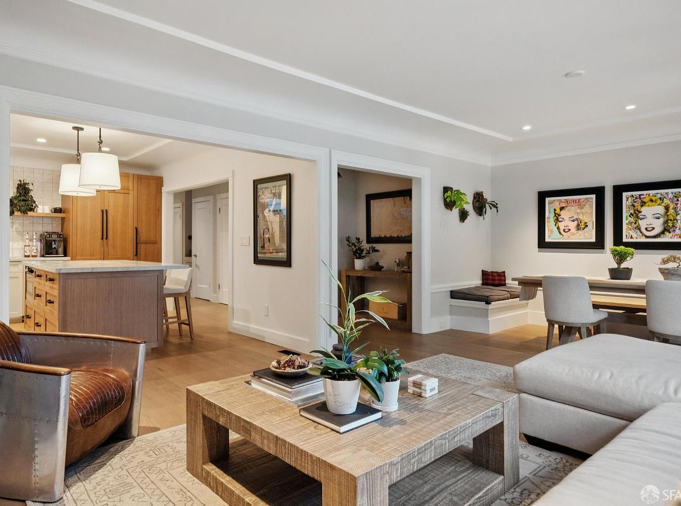 This living room showcases an open layout connecting to a kitchen. Dominated by neutral tones, the walls are painted in soft whites, complemented by light hardwood flooring. A large sectional sofa with a light fabric invites relaxation, while a rustic wooden coffee table adds warmth and texture. The room features an accent chair with leather elements, enhancing comfort and style. Bold artwork adorns the walls, incorporating vibrant colors and iconic imagery. A stylish dining area is present, featuring a modern table and sleek chairs. Potted plants infuse life, creating a dynamic balance between modernity and nature.