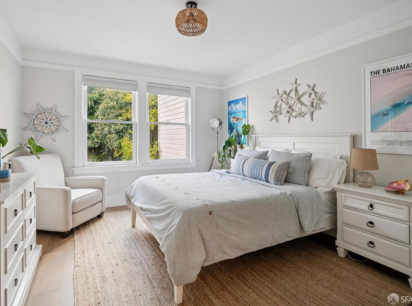 This bedroom showcases a serene, coastal aesthetic featuring light, airy tones. The walls are painted a soft gray, complemented by white trim and large windows that flood the space with natural light. A plush white bed is adorned with striped linens, and decorative pillows add subtle texture. To the side, a minimalist white nightstand holds a stylish lamp. A cozy reading chair, upholstered in light fabric, invites relaxation. Natural elements like a woven jute rug and potted greenery enhance the room’s tranquil vibe. Nautical decor, including a ship wheel and starfish wall art, provide thematic accents.