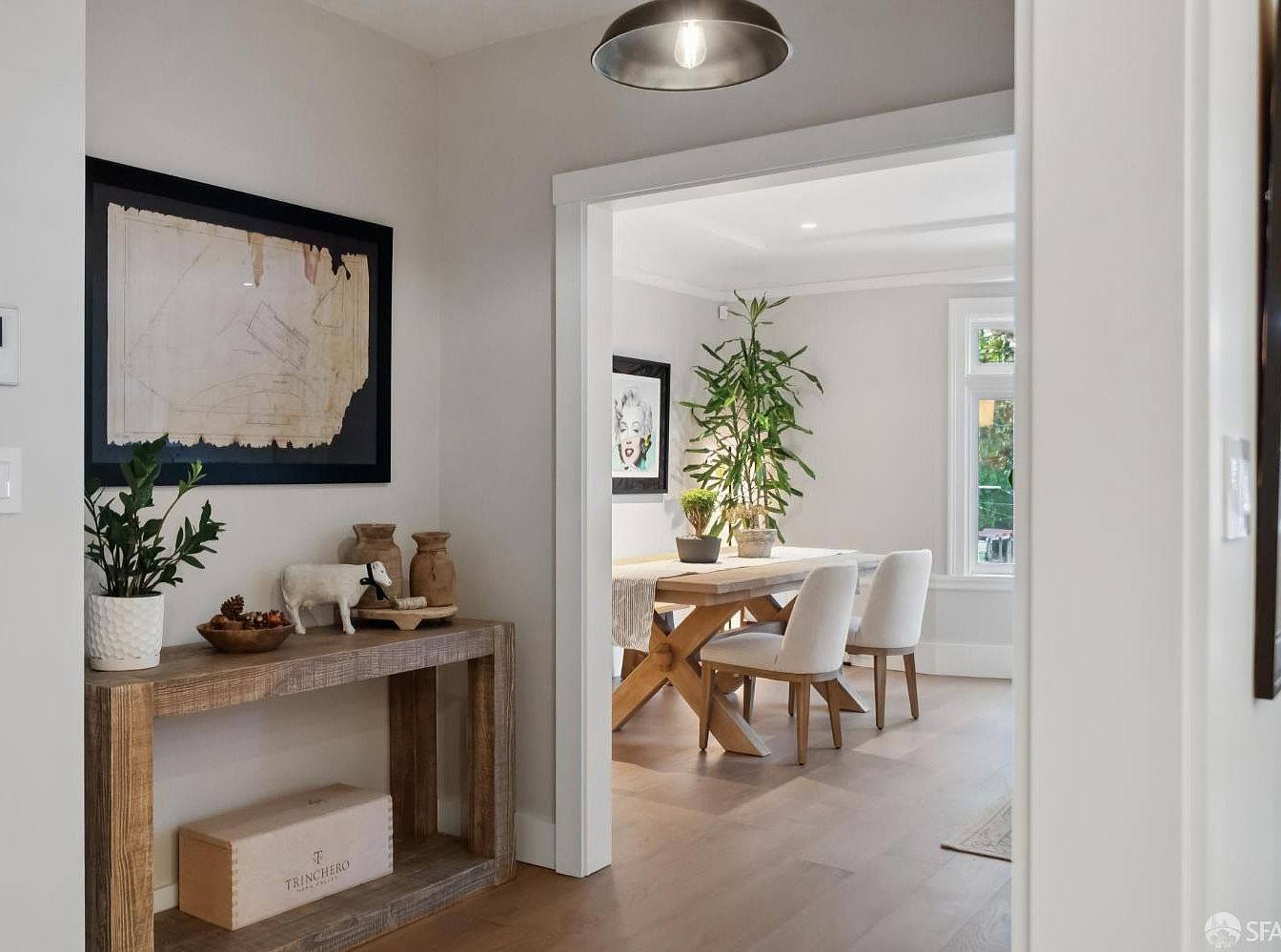 A welcoming entryway showcases a blend of rustic and modern elements. To the left, a wooden console table offers a textured contrast against light walls, adorned with a potted plant, decorative bowls, and earthenware vases. Above hangs an abstract piece of art framed in black, adding a sophisticated touch. The open doorway leads to a bright dining area featuring a large wooden table with an X-base, surrounded by upholstered neutral chairs. A vibrant greenery centerpiece adds life, while large windows allow natural light to flood the space. Warm wood flooring complements the airy atmosphere.