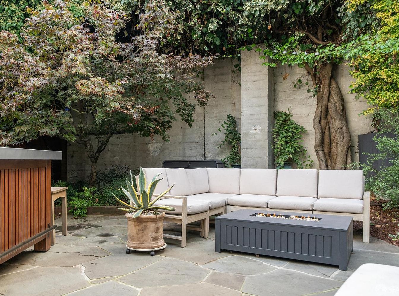This outdoor patio features a modern, L-shaped sectional sofa with soft, light beige upholstery, inviting relaxation. Centered is a stylish dark gray coffee table that incorporates a fire pit, enhancing the ambiance. Surrounding the seating area are lush greenery, including a variety of trees and shrubs, creating a natural sanctuary. A large potted agave plant adds a contemporary touch, while the textured stone flooring intersperses shades of gray and warm tones. The backdrop shows a concrete wall that harmonizes with the landscaped elements, emphasizing an aesthetic that blends comfort with natural beauty.