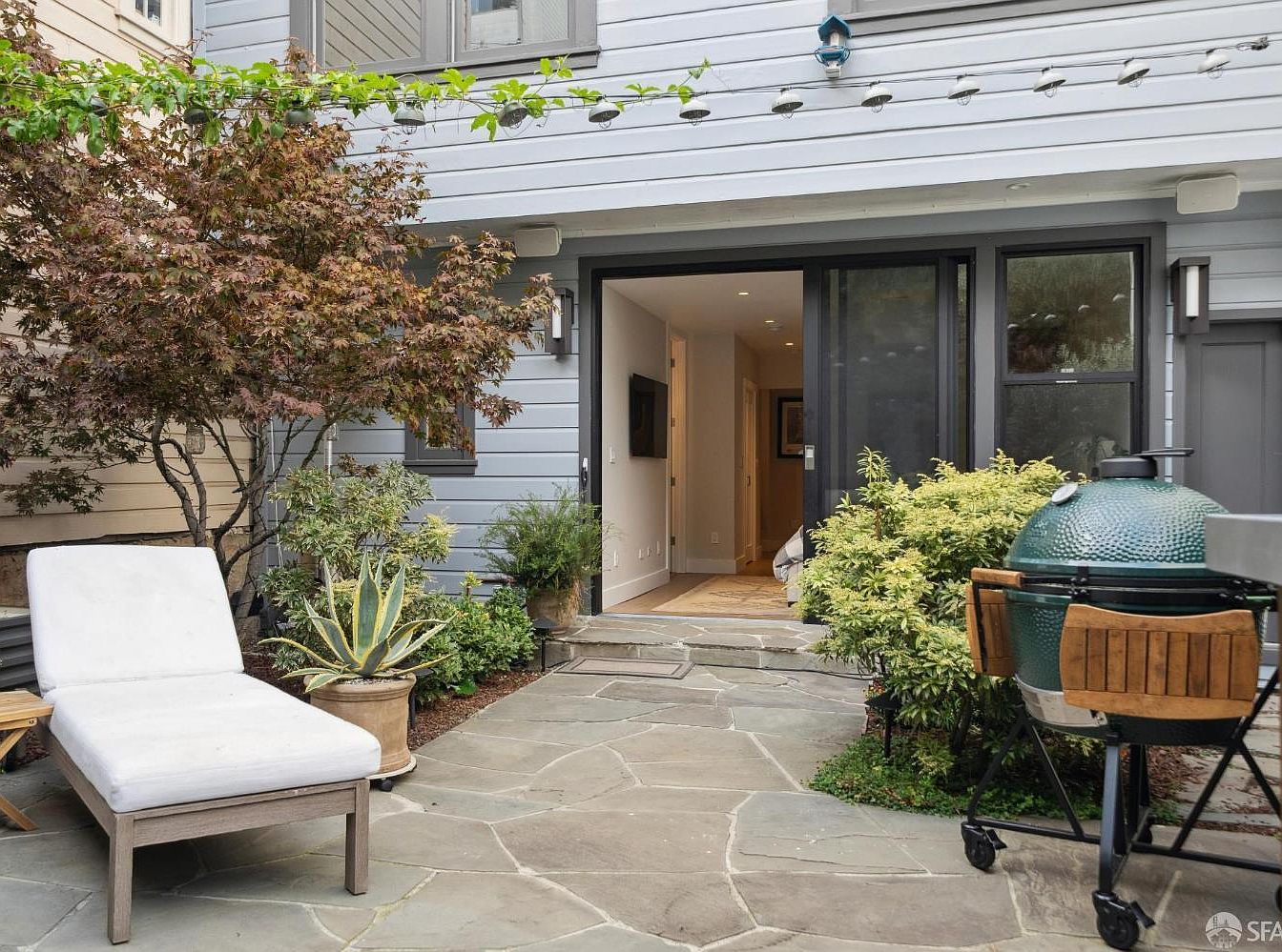 This outdoor patio features a blend of natural and modern elements, showcasing a stone tiled floor that enhances the welcoming atmosphere. A sleek white lounge chair with wooden legs invites relaxation, positioned beside lush greenery, including a vibrant Japanese maple and succulent plants. A well-equipped grill stands nearby, paired with a wooden cart, emphasizing outdoor dining. The soft gray siding of the house complements the natural hues, while glass sliding doors connect the interior space, creating an inviting transition. String lights add a cozy ambiance, perfect for evening gatherings.