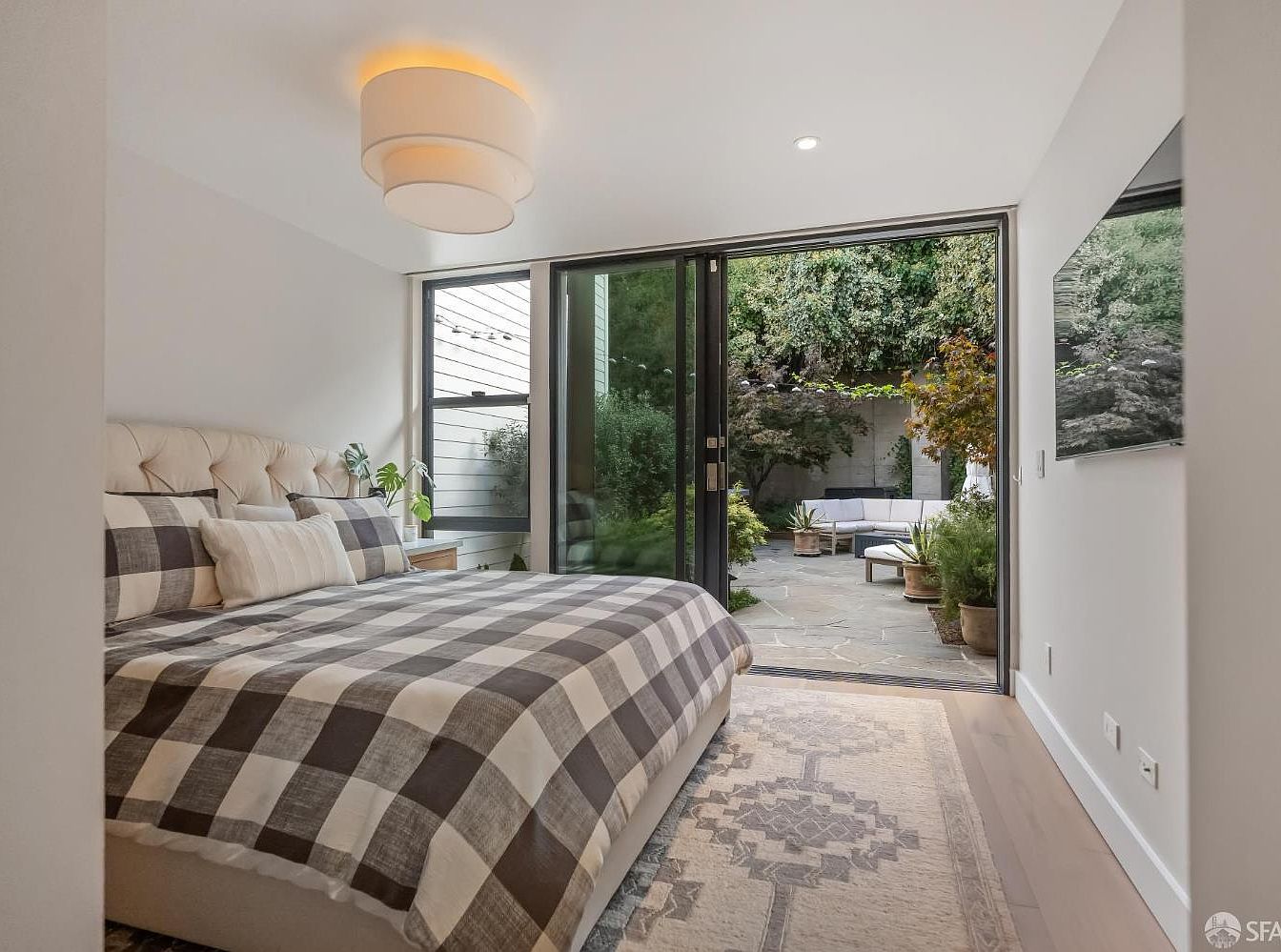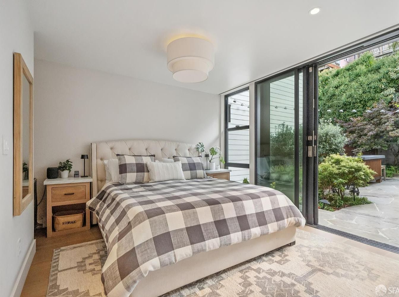 A stylish bedroom featuring a spacious layout with a king-sized bed dressed in a bold black and white plaid comforter, complemented by matching pillows. Natural light floods the room through expansive glass doors that lead to an outdoor patio, framed by lush greenery. The walls are painted a soft white, enhancing the room’s brightness. A modern pendant light hangs from the ceiling, adding a touch of elegance. A subtle area rug with intricate patterns sits beneath the bed, grounding the space. A minimalist nightstand on one side offers additional functionality against the contemporary backdrop.