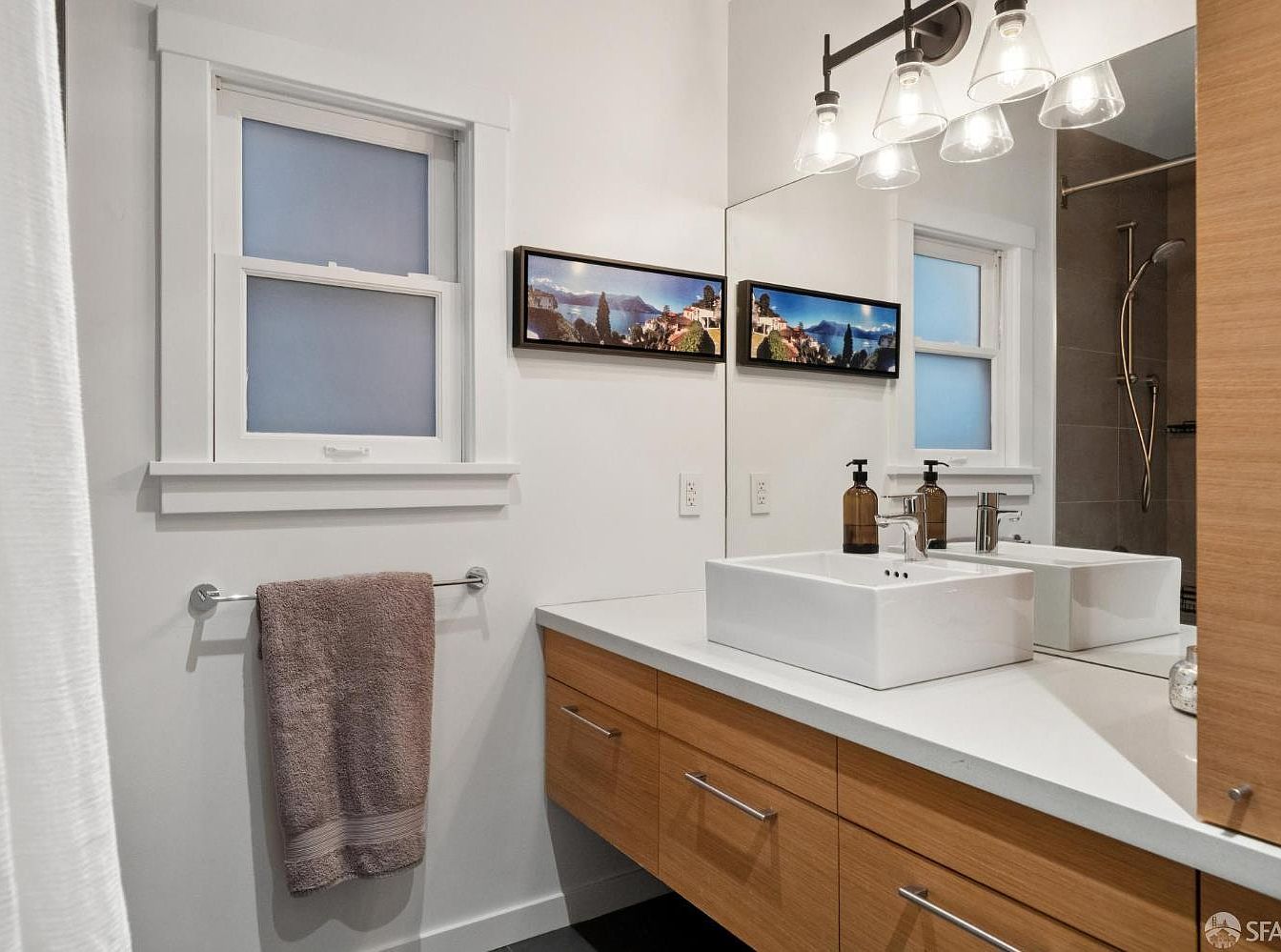 This modern bathroom features a minimalist design, emphasizing functionality and style. The color palette consists of crisp whites, warm wooden tones in the cabinetry, and dark accents from the flooring. A sleek, white double sink sits atop a smooth countertop, complemented by contemporary faucets. Above the sink, two framed paintings add a touch of personality. Natural light filters through a frosted window, enhancing the bright ambiance. The brushed metal towel rack holds a plush, taupe towel, contributing to the cozy feel. A stylish multi-bulb light fixture illuminates the space, highlighting the clean lines and modern aesthetic.