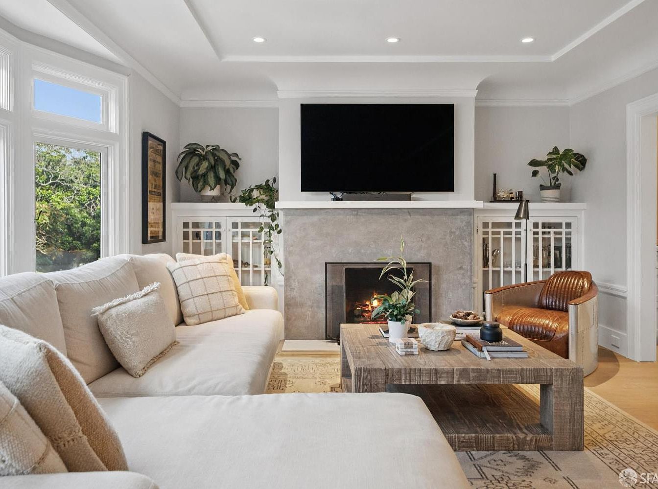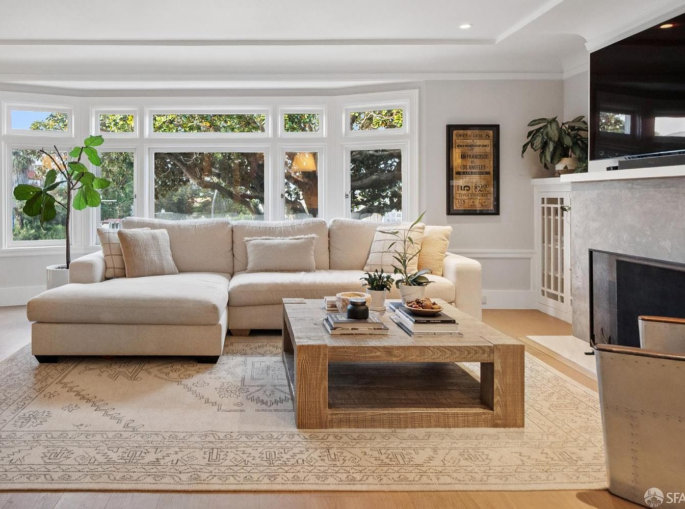 This living room features a spacious sectional sofa in a soft beige hue, complemented by throw pillows for additional comfort. A rustic wooden coffee table sits center stage, adorned with books and decorative items, creating a warm and inviting atmosphere. Light floods in through large bay windows, framed by white molding, offering views of greenery outside. The pale wood flooring enhances the room’s brightness, while a light area rug with subtle patterns adds coziness underfoot. A stylish television is mounted above the sleek fireplace, which is finished with a textured surface, uniting modern design with classic elegance.