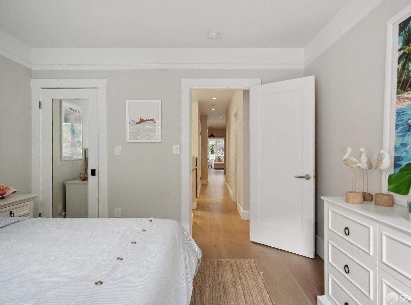 This serene bedroom features soft gray walls that create a tranquil atmosphere, complemented by crisp white trim and doorway details. A plush bed adorned with a striped duvet has decorative buttons, adding a touch of elegance. To the left, a mirrored door reflects light, enhancing the sense of space. The cozy, light-colored wooden floor extends into a well-lit hallway, visible through the open door ahead. A small area rug adds warmth, while subtle decorative elements, such as a neatly arranged nightstand and whimsical bird figurines on a dresser, contribute charming accents to this inviting space.