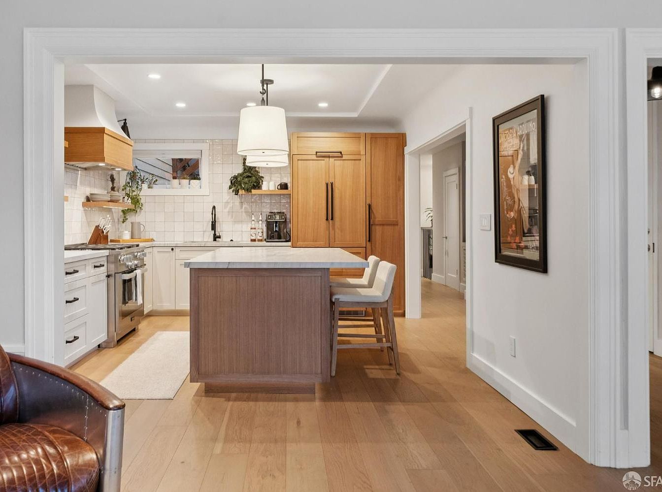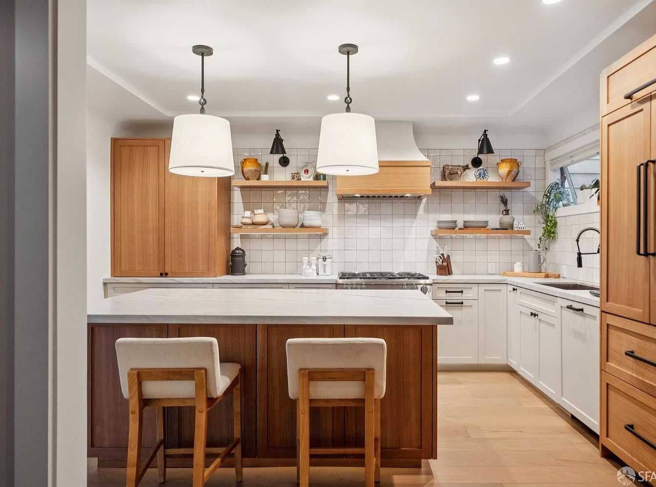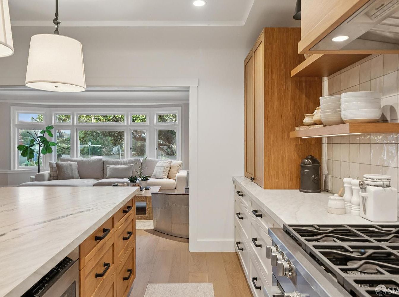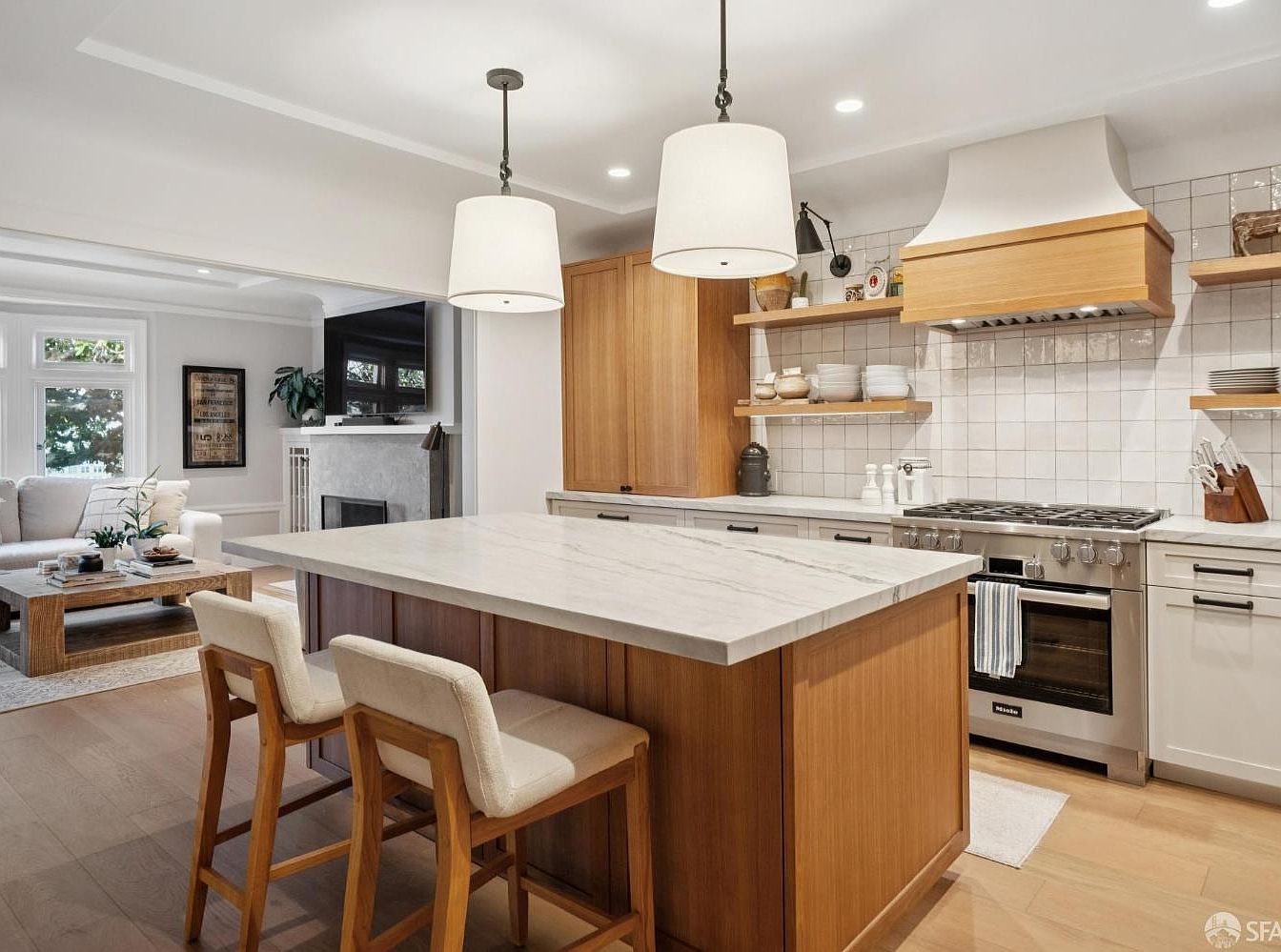 The kitchen features a contemporary layout with a central island topped with a sleek marble countertop. Warm wood cabinetry complements the light tones of the walls and flooring, creating an inviting atmosphere. Two pendant lights hang gracefully above the island, adding illumination and style. Open shelves display elegant dishware and decorative items, enhancing the room’s functionality while showcasing personality. A white tiled backsplash pairs neatly with the wooden accents, while a stainless steel stove and modern faucet complete the aesthetic. Ample natural light floods in through the window, enhancing the overall warmth and openness of the space.