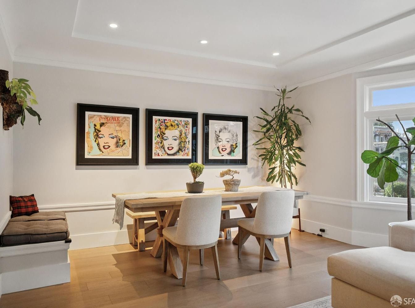 This dining area features a central wooden table with a light, natural finish and modern X-shaped legs, surrounded by soft upholstered chairs. The walls are painted in a subtle, warm tone, complementing the light hardwood flooring. Three colorful, framed portraits of Marilyn Monroe hang above the table, providing a striking focal point. A tall, leafy plant resides beside the window, adding a touch of greenery to the space. Recessed lighting in the ceiling softly illuminates the room, enhancing its inviting atmosphere. A cozy nook with a cushioned bench offers additional seating, adding charm and functionality.