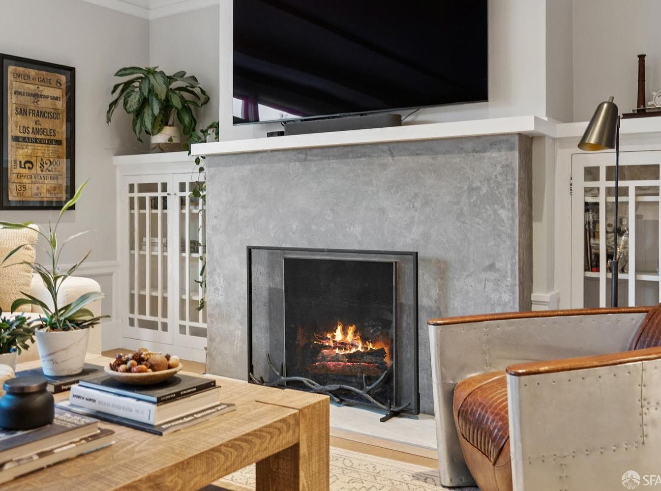 A cozy living room centers on a modern fireplace with a sleek gray stone facade, complemented by a black glass screen housing flickering flames. Above, a flat-screen TV is mounted, continuing the contemporary aesthetic. To the left, a tall plant adds a dash of greenery, while a vintage-style poster adorns the wall, bringing character. A rustic wooden coffee table displays a decorative bowl and books, surrounded by a light-colored couch with textured throw pillows. The space features warm beige tones against crisp white trims, creating an inviting atmosphere, perfect for relaxation and conversation.