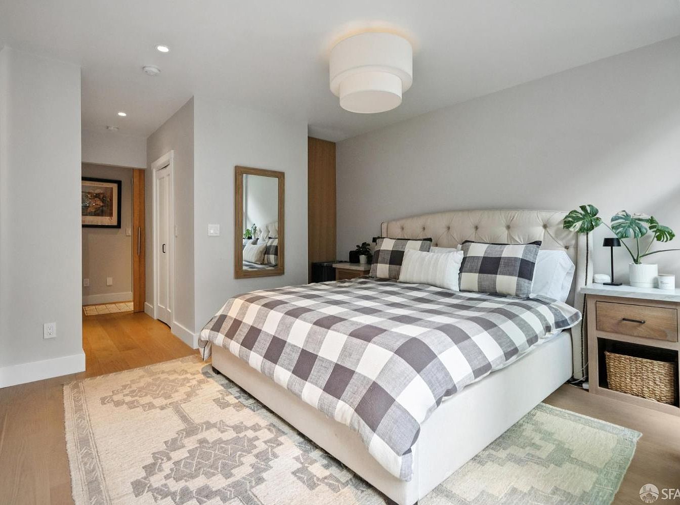 This bedroom features a calming palette of light gray walls and warm wooden flooring, creating a tranquil atmosphere. The centerpiece is a plush, tufted headboard framing an inviting king-sized bed, dressed in a stylish gray and white checkered duvet. Flanking the bed, crisp white and patterned pillows add texture. A large mirror reflects light and space while a small bedside table hosts a sleek lamp and a vibrant potted plant. Decorative elements include a patterned area rug that softens the hardwood floor and a brown storage unit, seamlessly blending functionality with aesthetic appeal.