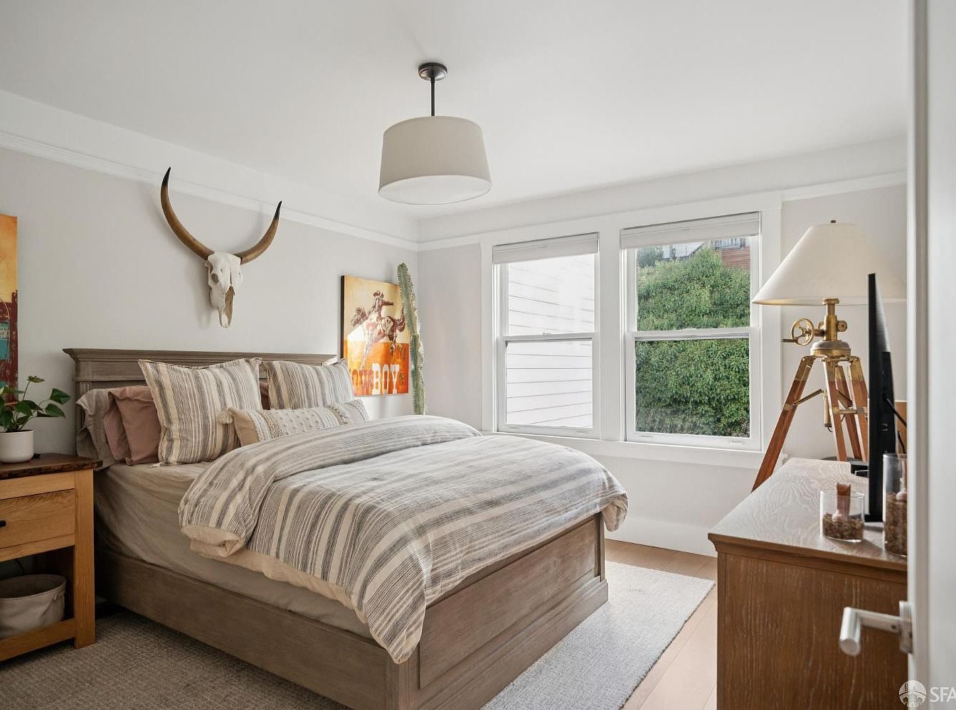 This cozy bedroom features a warm, neutral color palette with soft whites and light browns. A wooden bed frame is dressed in plush, striped bedding, inviting comfort. Above the bed, a decorative bull skull adds a rustic element, while vibrant artwork offers a pop of color. Natural light floods through two large windows, enhancing the airy feel. Nearby, a stylish lamp on a wooden tripod and a bedside table with a potted plant add functional decor. The room’s design combines contemporary style with natural elements, creating an inviting and serene atmosphere perfect for relaxation.