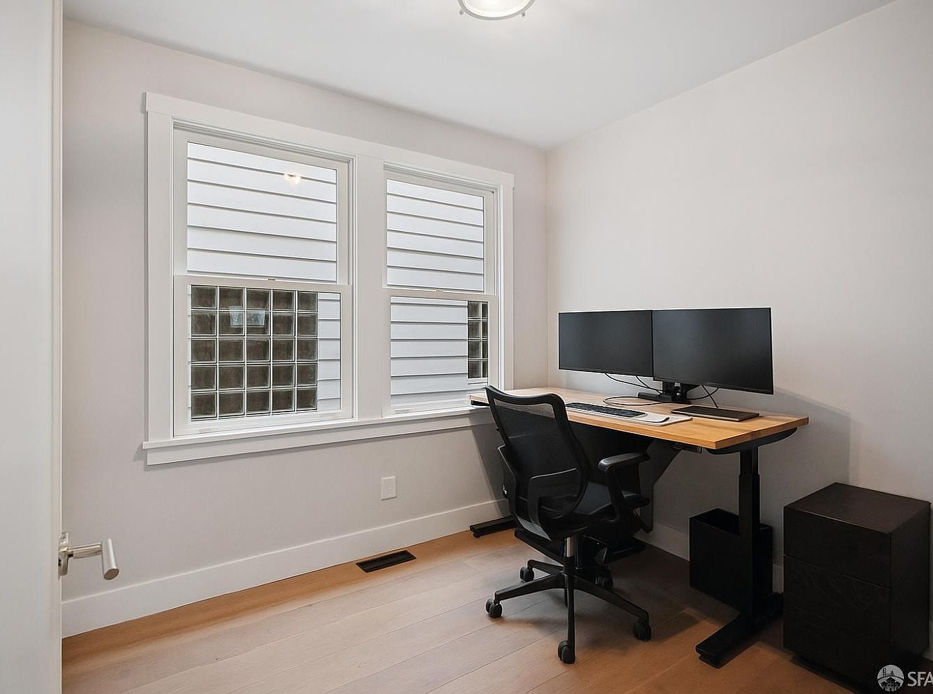 This home office features a minimalist design, with a light color palette dominated by soft whites and light wood tones. A sleek, wooden desk supports dual monitors, emphasizing functionality. The ergonomic black office chair adds comfort, while a modern black cabinet seamlessly integrates storage. Natural light streams through large windows with horizontal slats, allowing for adjustable privacy. The glass block window adds an interesting architectural detail, offering additional light while maintaining privacy. A subtle hardwood floor complements the overall aesthetic, enhancing the room’s contemporary feel and making it a pleasant workspace.