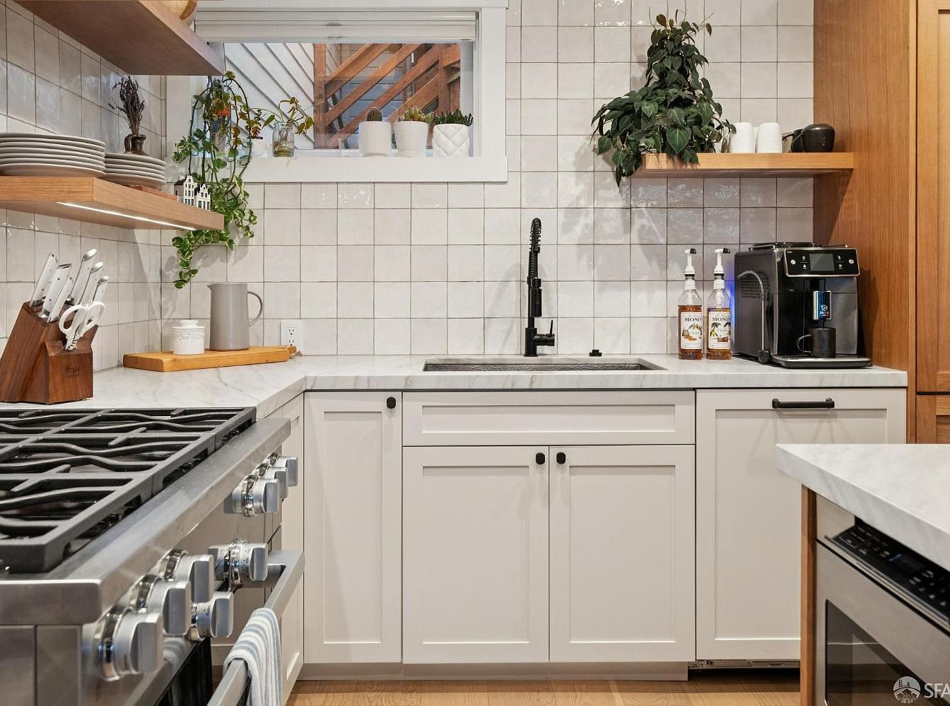 The kitchen showcases a contemporary design with a clean and functional layout. White cabinetry contrasts against a muted, tiled backsplash, creating a fresh and bright atmosphere. Open shelving displays dinnerware and plants, adding warmth. The countertop, made of sleek marble, complements the stainless steel appliances, including a gas range with polished knobs. A modern black faucet and sink are strategically placed underneath a window that allows natural light to flood the space. Light wood flooring enhances the airy feel, while touches of greenery from potted plants soften the sharp edges of the modern aesthetics.
