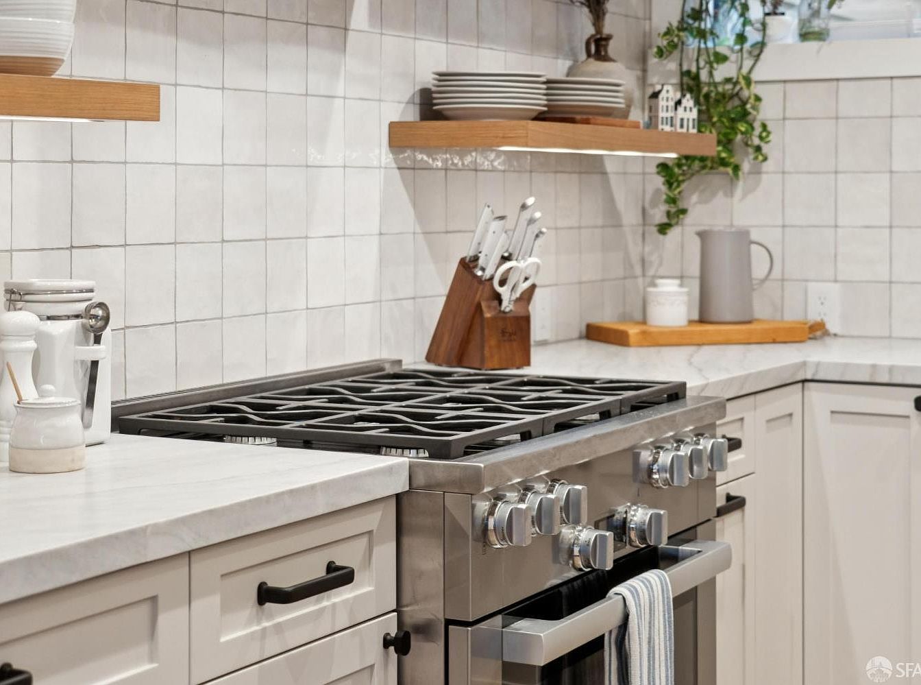 A modern kitchen equipped with high-end appliances showcases a sleek gas range with a black grate set against a white tiled backsplash. The cabinetry features light-colored, shaker-style doors contrasted by matte black handles. Open wooden shelves display neatly stacked plates and stylish kitchenware, adding an element of warmth. A wooden cutting board sits adjacent to a minimalist gray pitcher and a white ceramic canister, emphasizing a clean aesthetic. Natural light highlights the subtle textures of the marble countertop, while a potted plant adds a touch of greenery, enhancing the inviting atmosphere of the culinary space.