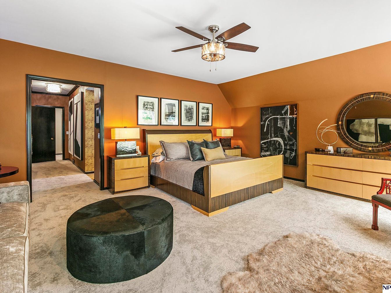 This spacious bedroom features a warm, earthy color scheme dominated by rich brown walls that create a cozy atmosphere. The focal point is the elegant bed with a striking combination of light wood and darker accents. Two modern nightstands with stylish lamps flank the bed, while a large round mirror adorns the wall beside a sleek dresser. An oval ottoman in dark fabric complements the soft, plush carpet covering the floor, enhancing comfort. Framed artwork adds a touch of sophistication, and the angled ceiling introduces an architectural interest, contributing to the room’s overall contemporary yet inviting aesthetic.