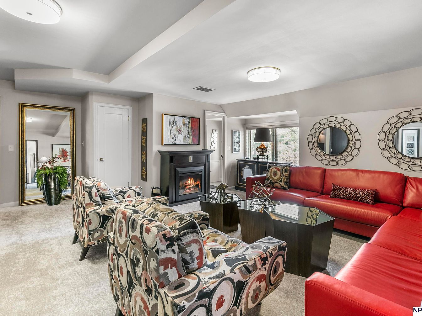 The living room features a vibrant layout with a bold red sectional couch that contrasts with the neutral carpet and painted walls. Two upholstered chairs display an eclectic, colorful pattern, adding visual interest. A shiny, mirrored coffee table reflects light and the surrounding decor, creating a spacious feel. Flanking the room are circular mirrors, enhancing depth and brightness. Natural light filters through window treatments, highlighting potted greenery beside a sleek black fireplace. Wall art in calming tones adds sophistication, while a modern light fixture overhead contributes to the contemporary aesthetic. An inviting atmosphere encourages relaxation and conversation.