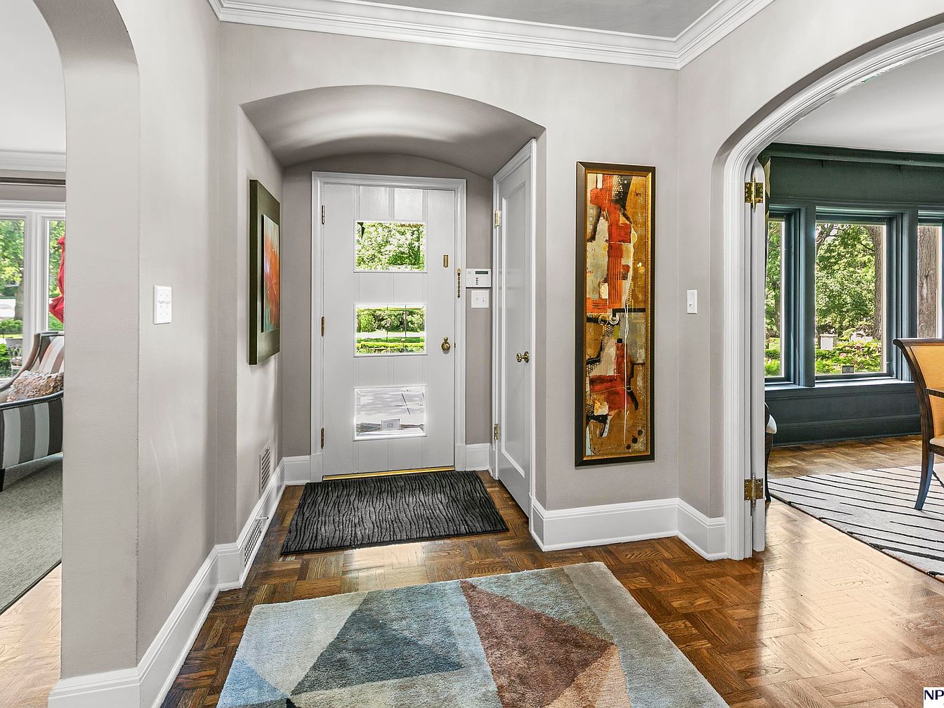 This entryway features warm wooden flooring with a rich parquet pattern, creating immediate warmth and connection. The walls are painted in a soft gray hue, enhancing the space’s brightness. Natural light streams through the front door, complemented by a stylish geometric area rug that integrates blue, beige, and rust tones. An abstract painting in a dark frame adds an artistic touch, contrasting beautifully with the muted wall color. To the right, arched doorways lead to adjacent rooms, showcasing elegant architectural details, while strategically placed lighting fixtures enhance the room’s inviting atmosphere, making it a welcoming introduction to the home.