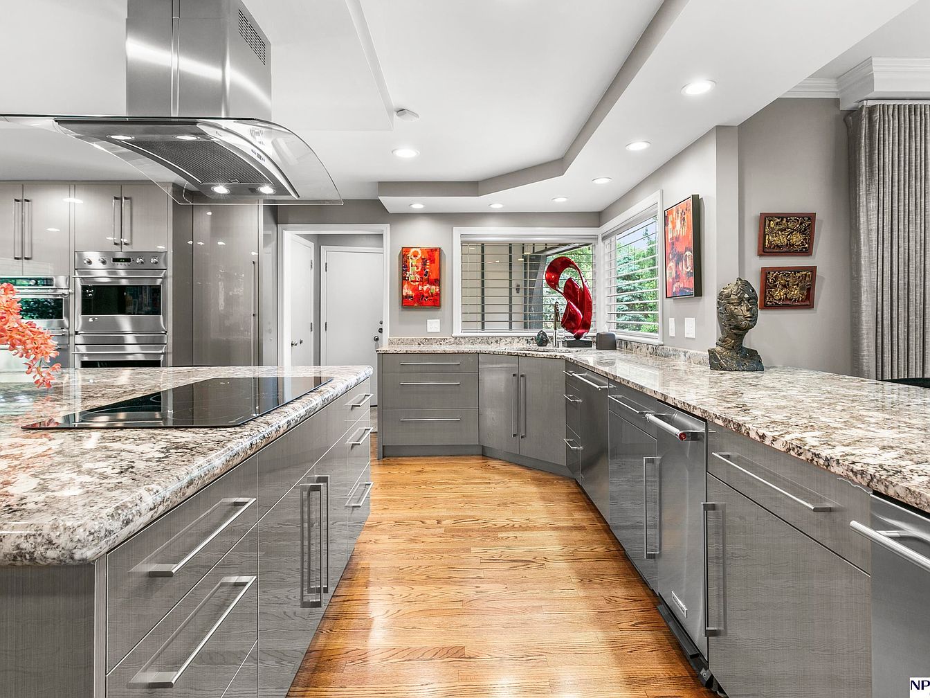 This modern kitchen features sleek, gray cabinetry with light-reflecting surfaces. The expansive island countertop showcases a speckled granite surface, blending tones of white, gray, and hints of gold. Stainless steel appliances, including a double oven and dishwasher, complement the contemporary design. Recessed lighting illuminates the space, enhancing the airy ambiance. On the wall, a colorful abstract art piece adds a vibrant contrast to the neutral palette. A sculptural decor piece and an arrangement of fresh flowers on the countertop bring a touch of freshness, while wood flooring warms the overall aesthetic with a natural element.