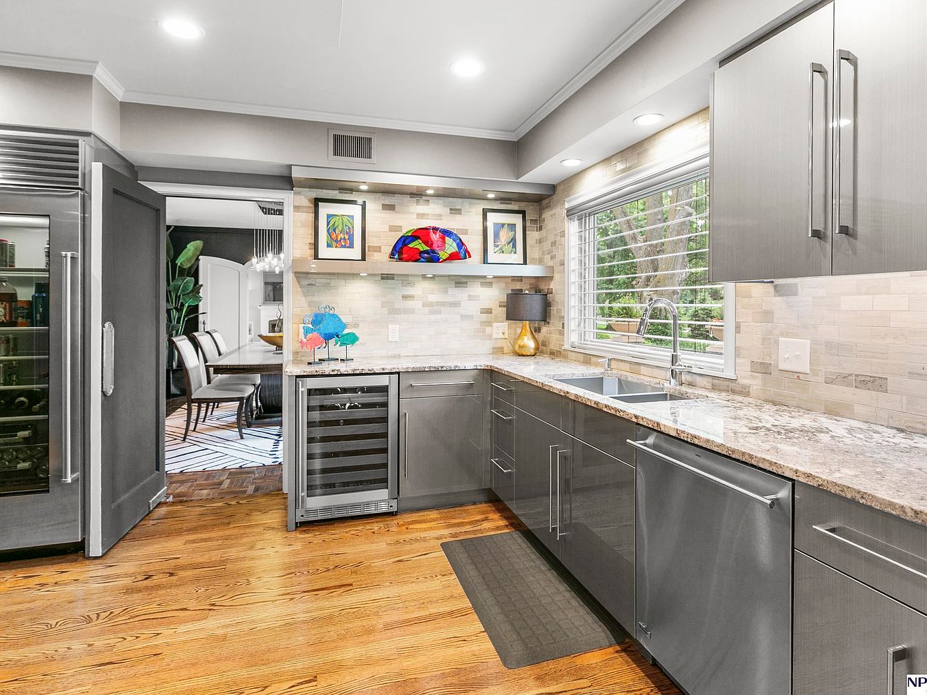 A sleek modern kitchen featuring an L-shaped layout with rich gray cabinetry and a stunning granite countertop. Under-cabinet lighting accentuates the mosaic tiled backsplash, which introduces subtle earth tones. Stainless steel appliances, including a large built-in refrigerator and a wine cooler, blend seamlessly with the cabinetry. A deep sink and brushed metal fixtures provide a contemporary touch. The hardwood flooring adds warmth, contrasting elegantly with the cool tones of the kitchen. Decorative artwork and a small plant on the countertop contribute vibrant color, while the window offers a glimpse of greenery outside, enhancing the inviting atmosphere.