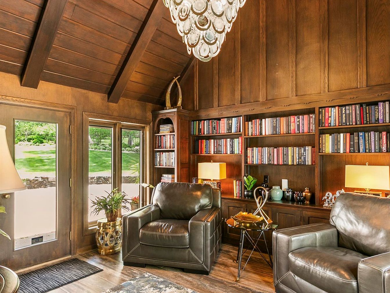 A cozy reading nook features rich wooden paneling and a vaulted ceiling accented by dark beams. Two comfortable leather armchairs are oriented towards a stylish glass side table with gold details. A wall of bookshelves showcases a colorful array of books, flanked by modern table lamps providing a warm glow. Large windows view the lush outdoor landscape, inviting natural light into the space. A potted plant adds a touch of greenery, enhancing the tranquil atmosphere. The overall color palette blends deep browns with hints of gold and green, creating a sophisticated yet inviting retreat for relaxation.