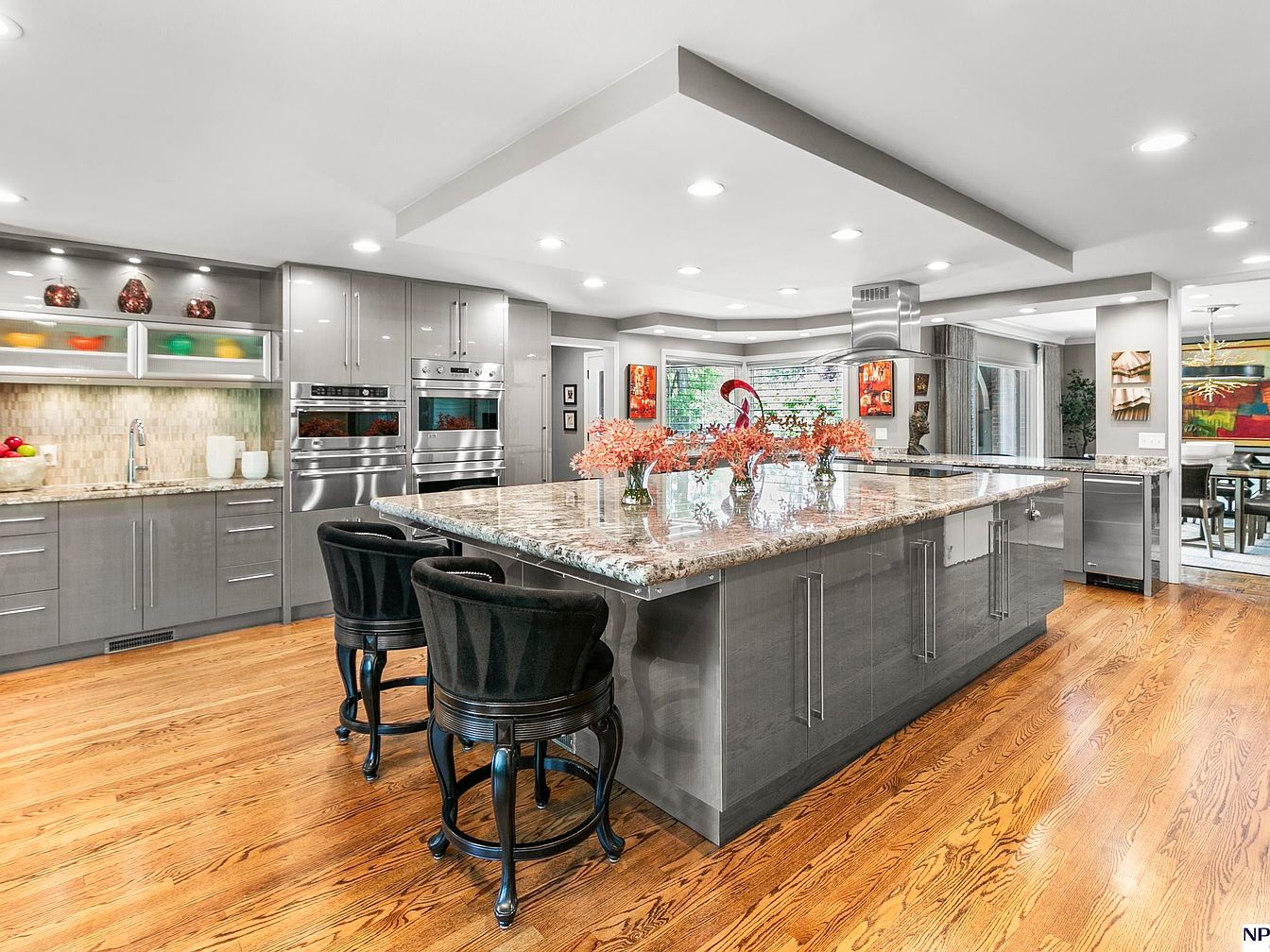 This spacious kitchen features sleek gray cabinetry and a striking granite countertop. An expansive island serves as a focal point, paired with stylish black upholstered stools. Polished hardwood flooring adds warmth to the space, enhancing the contemporary feel. Stainless steel appliances are seamlessly integrated into the cabinetry, reflecting a modern aesthetic. Bright accent colors in decorative glass bowls and wall art bring vibrancy, while recessed lighting offers a clean, uncluttered ambiance. The open layout connects to a dining area, inviting social interaction. Overall, the design blends functionality with a chic, minimalist style that is both inviting and sophisticated.