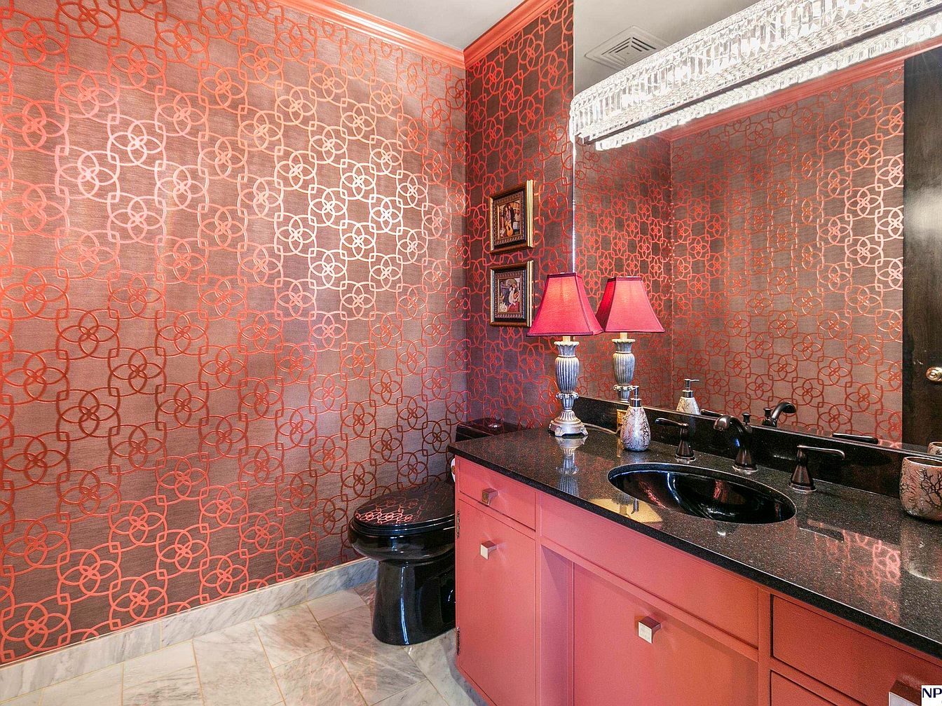 This elegant powder room features a striking wallpaper with intricate, metallic coral patterns that create a rich visual texture. Complementing this design, the cabinetry showcases a warm, muted peach tone, adding a soft contrast. A black granite countertop supports a stylish sink and chic fixtures, enhancing the luxurious feel. Two stylish lamps with red shades illuminate the space, casting a warm glow. The black toilet seamlessly integrates into the aesthetic, while the marble floor adds sophistication with its subtle veining. Above the sink, a trendy light fixture adds a modern touch, harmonizing with the room’s overall elegance.