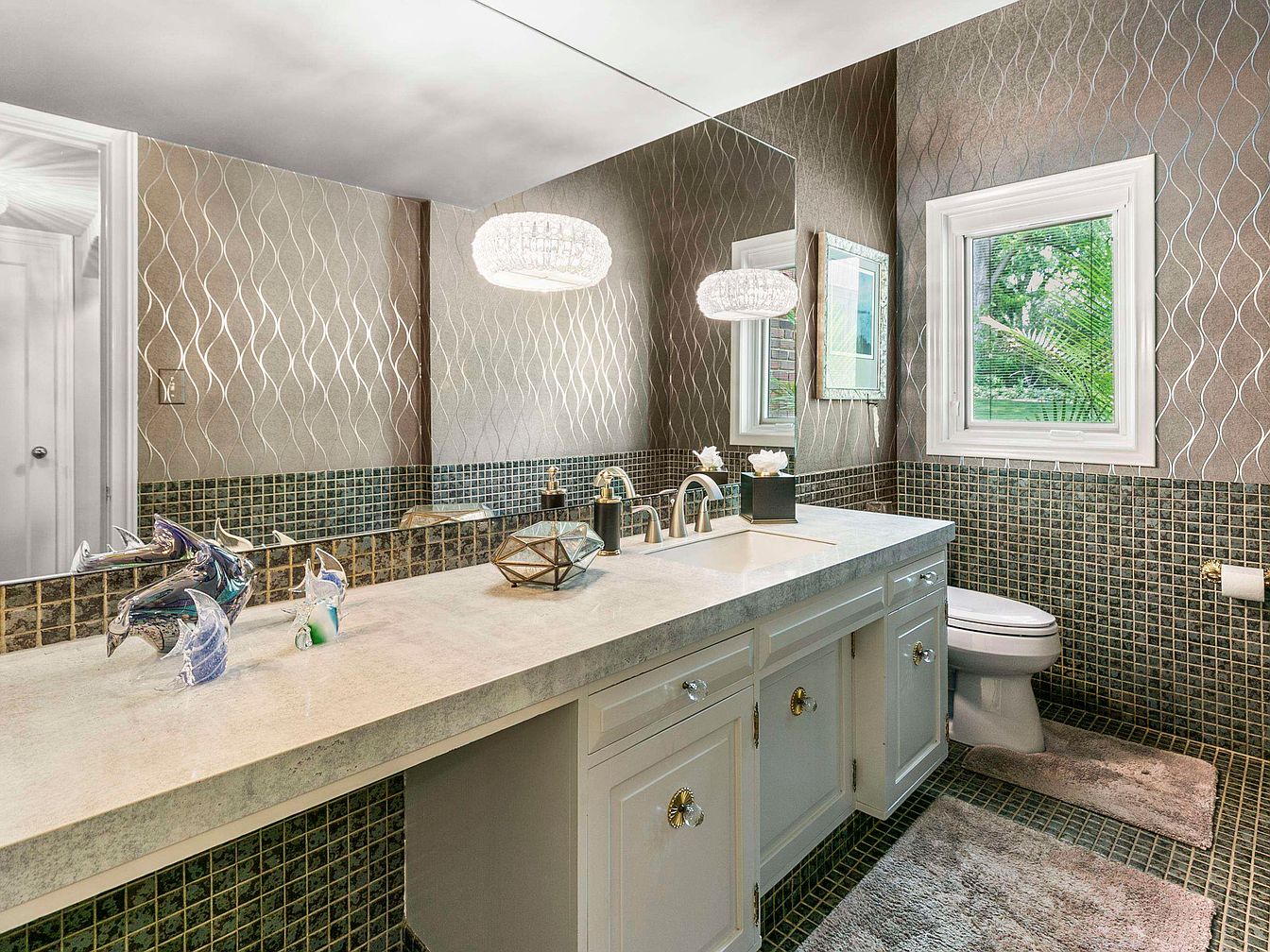 This bathroom features a modern design with a spacious layout. The walls are adorned with expansive, shimmering wallpaper in a silver wave pattern, creating an elegant ambiance. A sleek, light-hued countertop rests atop white cabinetry with round, decorative knobs. The subtle green and black mosaic tiles line the lower wall, enhancing the contemporary feel. A stylish crystal chandelier illuminates the space, while a large, framed mirror reflects light from the adjacent window. Decorative elements, including colorful glass sculptures and geometric decor pieces, add artistic flair to the clean, minimalist aesthetic of this sophisticated bathroom.