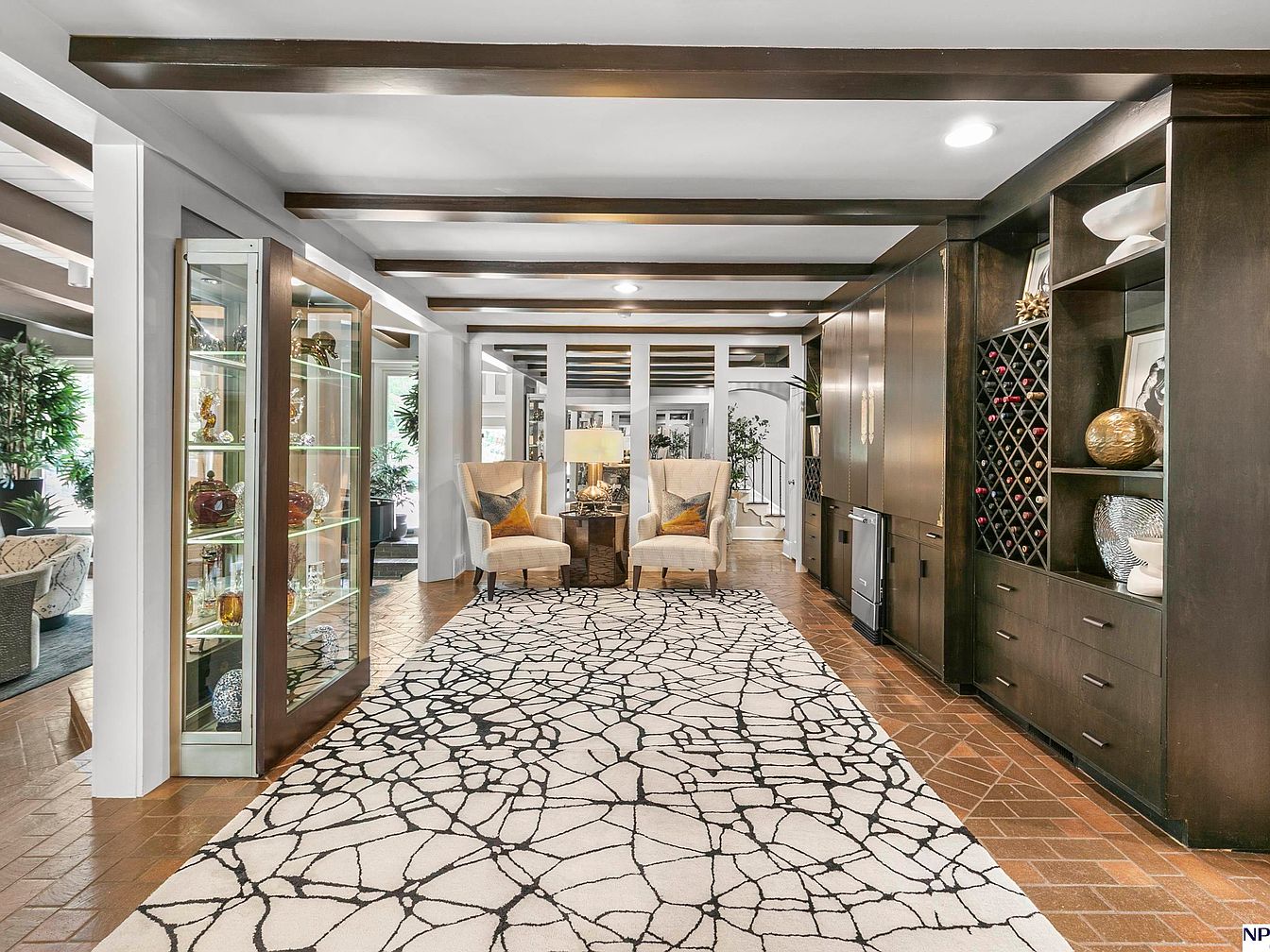 A welcoming foyer showcases a stylish layout with a notable area rug featuring an abstract black-and-cream pattern, enhancing the space’s modern aesthetic. To the right, a large display cabinet holds elegant glassware and decorative items, while a wooden wine rack adds a touch of sophistication. Two upholstered armchairs in soft cream flank a small coffee table, accented with a decorative pillow that adds warmth. Dark wooden beams line the ceiling, contrasting against the light walls, creating a cozy yet open atmosphere. The rich brown tile floor pairs harmoniously with greenery visible through large windows, infusing the space with life.