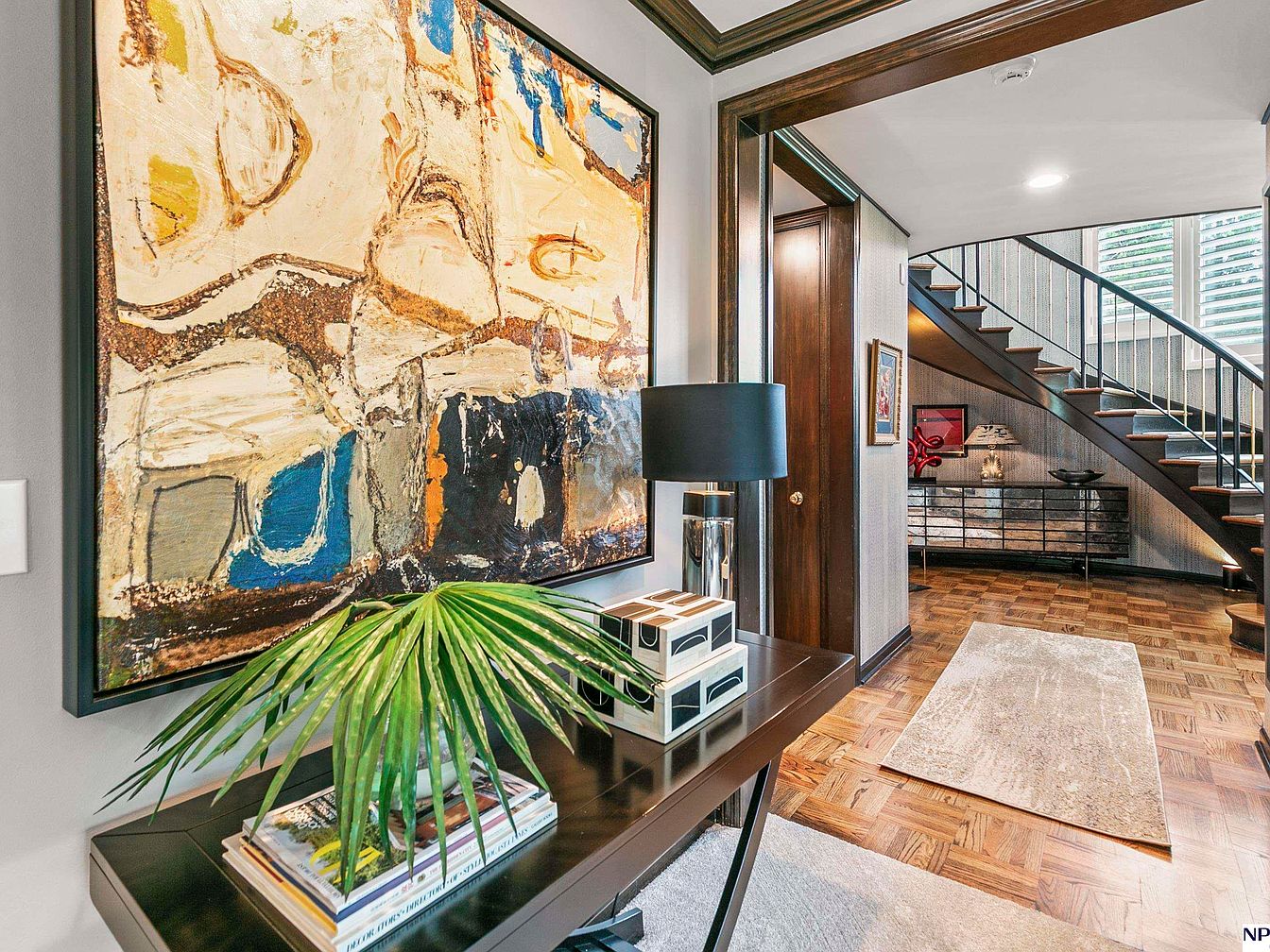 This stylish entryway features a dynamic blend of contemporary and traditional design elements. A large, colorful abstract painting hangs prominently on the wall, attracting attention with its vibrant strokes of blue, orange, and earthy tones. Below, a sleek black console table holds various decorative items, including a potted plant that adds a refreshing touch. A plush area rug defines the space, complementing the rich, patterned wooden flooring. The staircase, with its modern railing, invites visitors to explore further, while soft lighting enhances the warm ambiance of this welcoming introduction to the home.