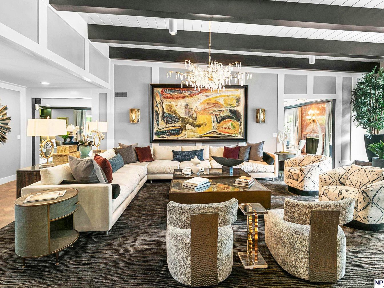 This living room features a spacious layout with a contemporary design, highlighted by a large sectional sofa adorned with colorful cushions in shades of blue, burgundy, and gray. The area rug, rich in texture, grounds the space, while the dark wooden beams overhead add architectural interest. A striking abstract painting serves as a focal point on the wall, complemented by stylish wall sconces. Two unique accent chairs add flair with their patterned upholstery. A chic coffee table with a glass top sits at the center, surrounded by art books. Lush greenery peeks in from the adjacent room, enhancing the aesthetic.