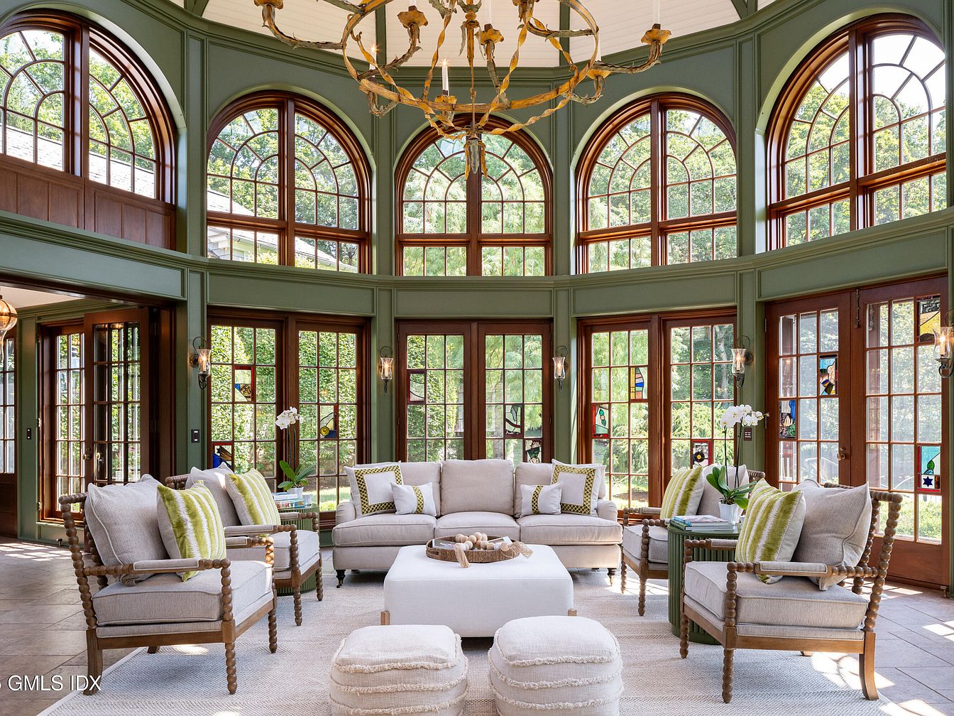 This elegant family sunroom features soaring walls of large, arched windows and glass-paneled double doors, flooding the room with natural light and offering seamless views of lush greenery outside. Rich olive green paneling frames the windows and doorways, creating a tranquil yet sophisticated atmosphere. The comfortable seating arrangement includes ample plush sofas and armchairs topped with fresh striped green and white accent pillows, gathered around a central white ottoman. Light neutral rugs and poufs add warmth and softness, making the space inviting for adults and children alike. Delicate sconces and a dramatic gold chandelier enhance the warm, family-friendly ambiance.